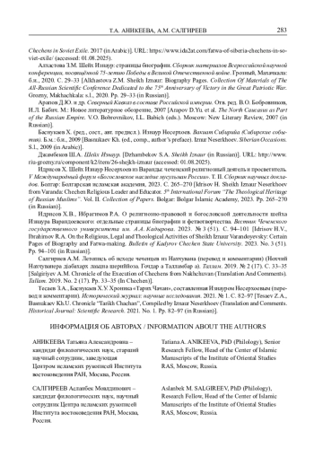 7. Салгириев А.М. Летопись об исходе чеченцев из Нахчувана (перевод и комментарии) (Нохчий Нахчуванера дiабахарх лаьцна шериййоза. Гочдар а Талламбар а). Таллам. 2019. № 2(17). С. 33-35.