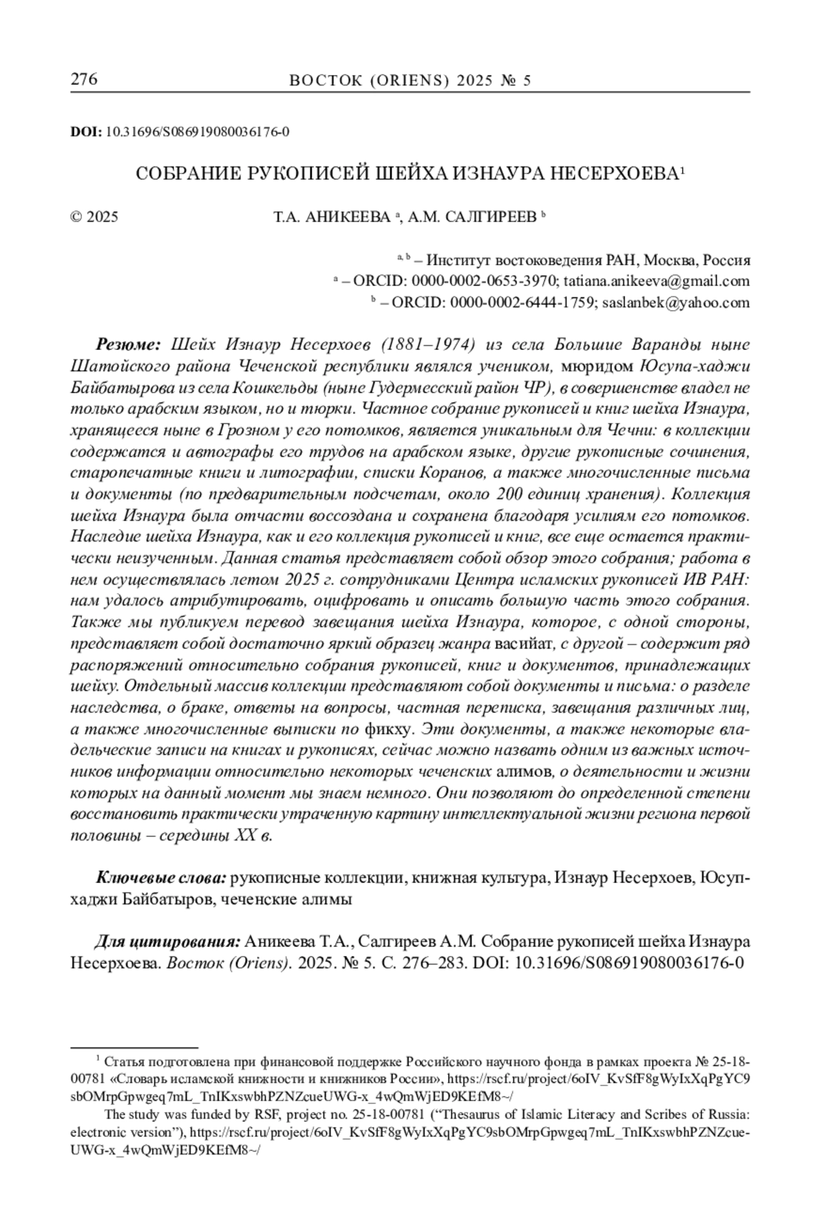 Шейх Изнаур Несерхоев (1881–1974) из села Большие Варанды ныне Шатойского района Чеченской республики являлся учеником, мюридом Юсупа-хаджи Байбатырова из села Кошкельды (ныне Гудермесский район ЧР), в совершенстве владел не только арабским языком, но и тюрки. Частное собрание рукописей и книг шейха Изнаура, хранящееся ныне в Грозном у его потомков, является уникальным для Чечни: в коллекции содержатся и автографы его трудов на арабском языке, другие рукописные сочинения, старопечатные книги и литографии, списки Коранов, а также многочисленные письма и документы (по предварительным подсчетам, около 200 единиц хранения). Коллекция шейха Изнаура была отчасти воссоздана и сохранена благодаря усилиям его потомков. Наследие шейха Изнаура, как и его коллекция рукописей и книг, все еще остается практически неизученным. Данная статья представляет собой обзор этого собрания; работа в нем осуществлялась летом 2025 г. сотрудниками Центра исламских рукописей ИВ РАН: нам удалось атрибутировать, оцифровать и описать большую часть этого собрания. Также мы публикуем перевод завещания шейха Изнаура, которое, с одной стороны, представляет собой достаточно яркий образец жанра васийат, с другой – содержит ряд распоряжений относительно собрания рукописей, книг и документов, принадлежащих шейху. Отдельный массив коллекции представляют собой документы и письма: о разделе наследства, о браке, ответы на вопросы, частная переписка, завещания различных лиц, а также многочисленные выписки по фикху. Эти документы, а также некоторые владельческие записи на книгах и рукописях, сейчас можно назвать одним из важных источников информации относительно некоторых чеченских алимов, о деятельности и жизни которых на данный момент мы знаем немного. Они позволяют до определенной степени восстановить практически утраченную картину интеллектуальной жизни региона первой половины – середины XX в.