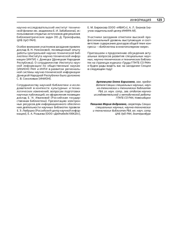 Приглашаем к продолжению обсуждения актуальных вопросов развития специальных научных, научно-технических и технических библиотек на страницах журнала «Труды ГПНТБ СО РАН» и будем рады видеть вас на заседании Секции в следующем году!