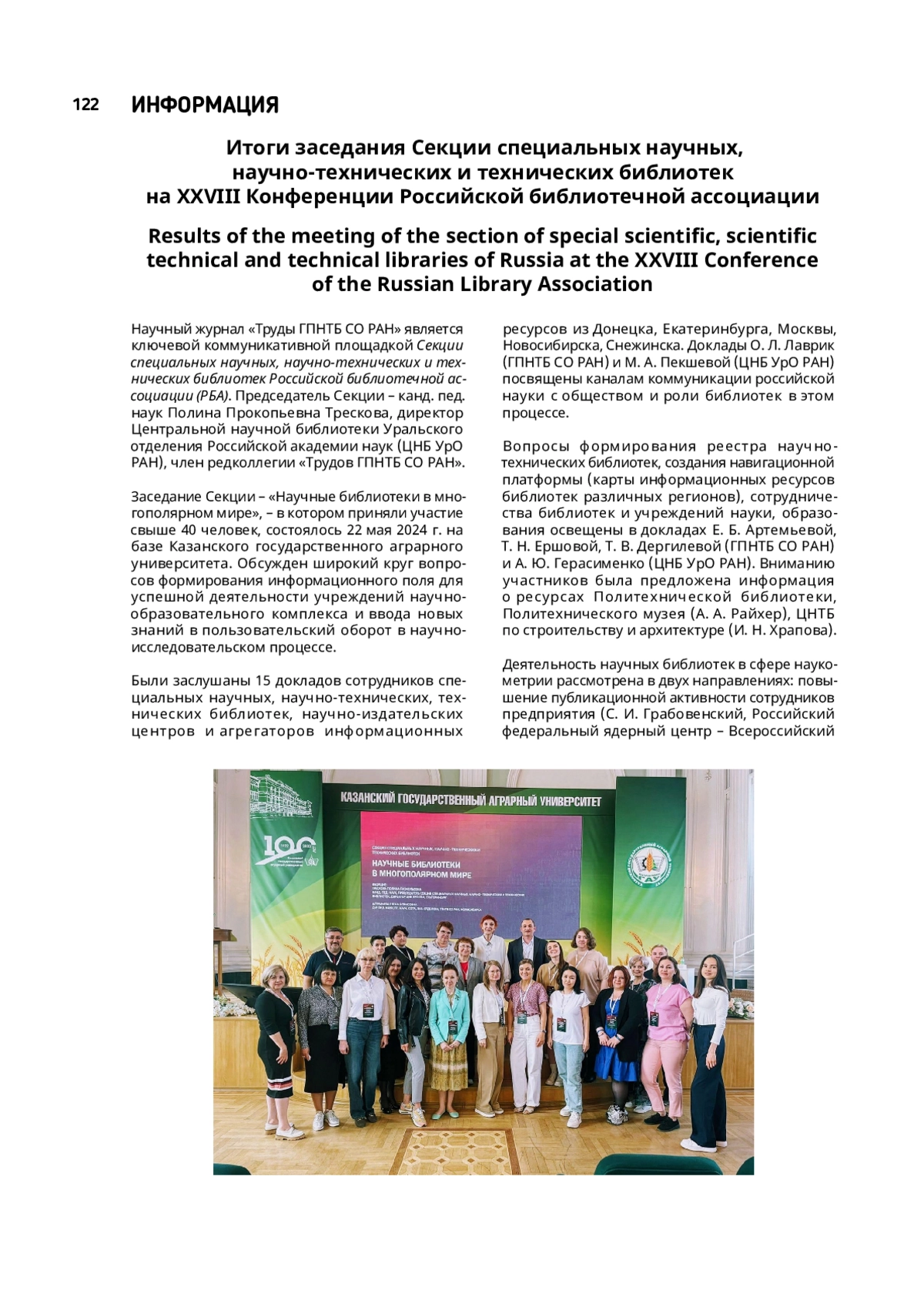 Для цитирования: Артемьева Е. Б., Пекшева М. А. Итоги заседания Секции специальных научных, научно-технических и технических библиотек на XXVIII Конференции Российской библиотечной ассоциации. Труды ГПНТБ СО РАН. 2024;(2):122-123.