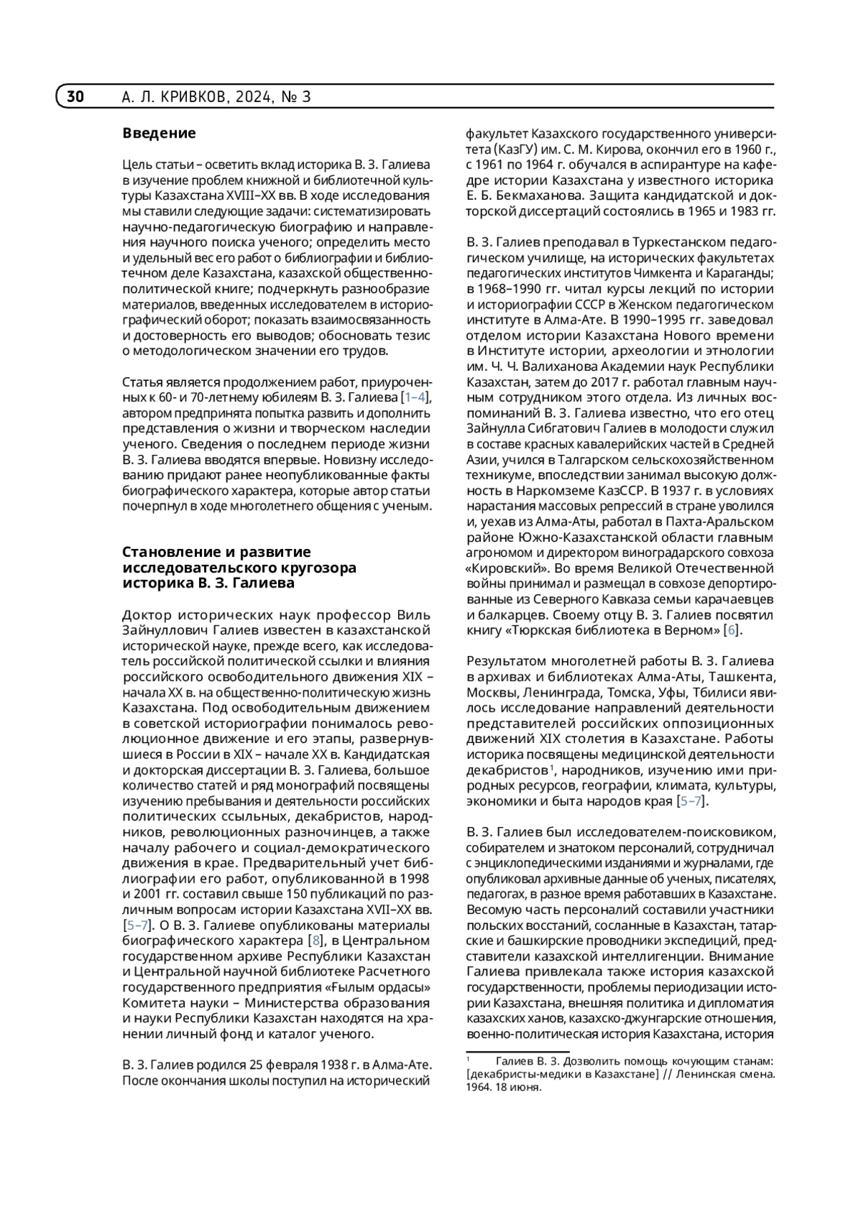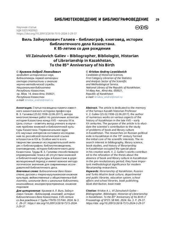 Статья посвящена памяти известного казахстанского историка профессора В. З. Галиева (25.02.1938–22.06.2017), автора многочисленных работ по различным аспектам истории Казахстана конца ХVII – начала ХХ в. Цель статьи – осветить вклад ученого в изучение проблем книжной и библиотечной культуры Казахстана. Первоначальное ядро его научных интересов составили исследования по российской политической ссылке в Казахстан в ХIХ в. Особое место в его творчестве занимал исследовательский интерес к библиографии, библиотековедению, книговедению, истории библиотечного дела Казахстана. Труды В. З. Галиева способствовали опровержению тезиса об отсутствии книжной и библиотечной культуры в Казахстане в дореволюционный период и имеют важное методологическое значение для современных исследователей библиотечного дела.