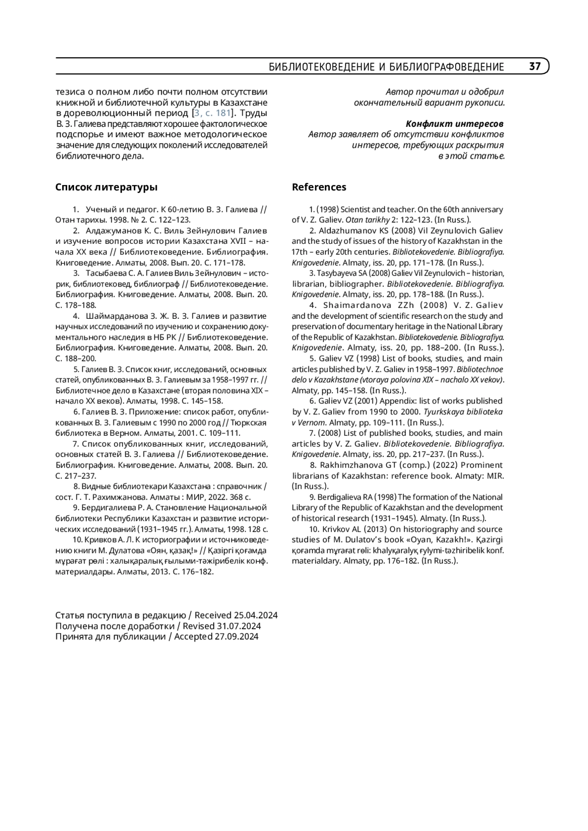 4. Шаймарданова З. Ж. В. З. Галиев и развитие научных исследований по изучению и сохранению документального наследия в НБ РК // Библиотековедение. Библиография. Книговедение. Алматы, 2008. Вып. 20. С. 188-200.