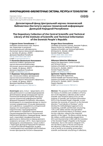 Цель статьи – представить историю деятельности и условия формирования депозитарного фонда Центральной научно-технической библиотеки (ЦНТБ) Института научно-технической информации (ИНТИ) Донецкой Народной Республики, обосновать необходимость исследования фонда по тематическому направлению «Угольная промышленность Донбасса» и разработать методический подход к его мониторингу и научно-тематическому структурированию.