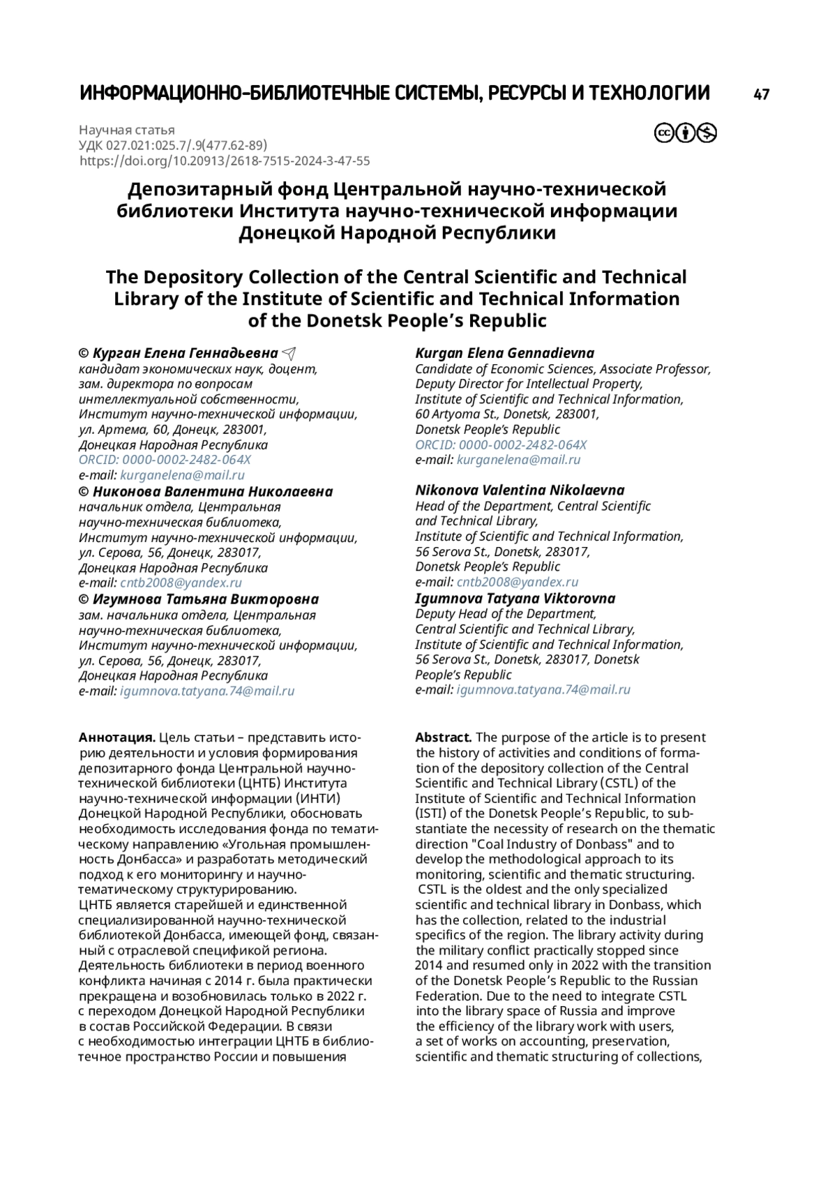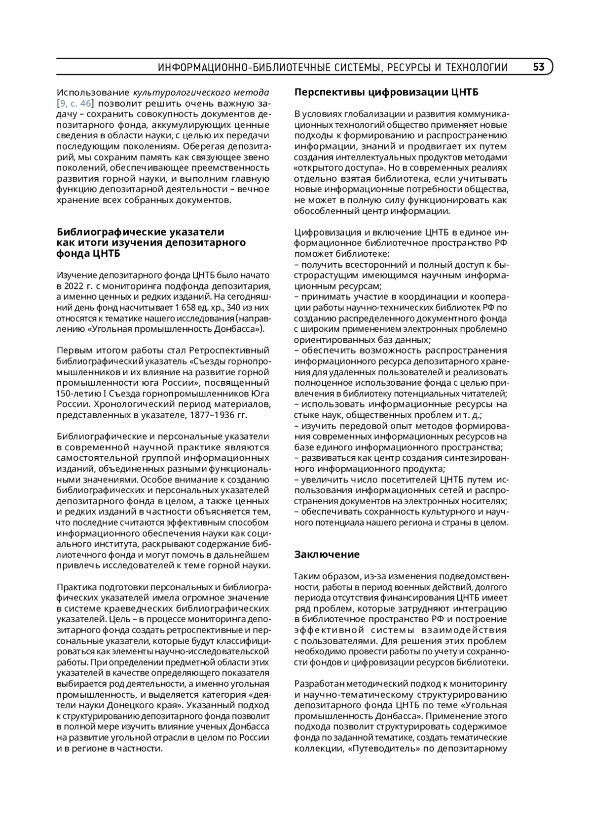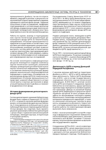 6. Солдатова В. В., Курган Е. Г. Задачи, стоящие перед ЦНТБ ФГБНУ «ИНТИ» в условиях восстановления промышленного потенциала Донбасса // Состояние и перспективы развития международной государственной сети научно-технической информации : сб. материалов Междунар. науч.-практ. конф. (Минск, 19-20 июня 2023 г.). Москва, 2024. С. 27-35. https://doi.org/10.33186/978-5-85638-272-2-2024-27-35.