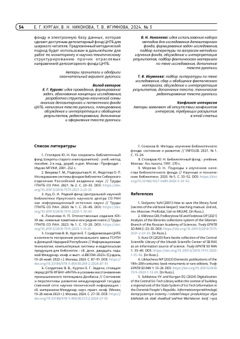 3. Куц О. И. Редкий фонд Центральной научной библиотеки Иркутского научного центра СО РАН как информационный источник науки // Труды ГПНТБ СО РАН. 2020. № 1. С. 35-40. https://doi.org/10.20913/2618-7515-2020-1-35-40.