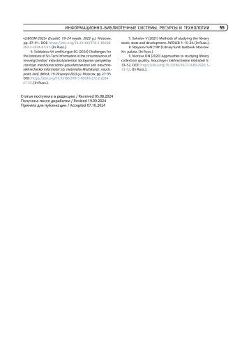 7. Соколов В. Методы изучения библиотечного фонда: состояние и развитие // INFOLIB. 2021. № 1. С. 15-24.