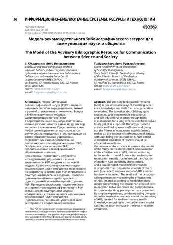 Рекомендательный библиографический ресурс (РБР) – один из надежных способов передачи опыта, знаний и умений от поколения к поколению. Вопрос о библиографических ресурсах, удовлетворяющих потребности в образовательном и самообразовательном чтении, разрабатывается давно, но до сих пор не решен окончательно. Представляется, что любая целенаправленная познавательная деятельность посредством книг, выходящая за рамки образовательных учреждений, составляет суть самообразовательной деятельности, и опорой для нее служат РБР. Особую роль должны играть РБР, предназначенные для информального образования читателей.