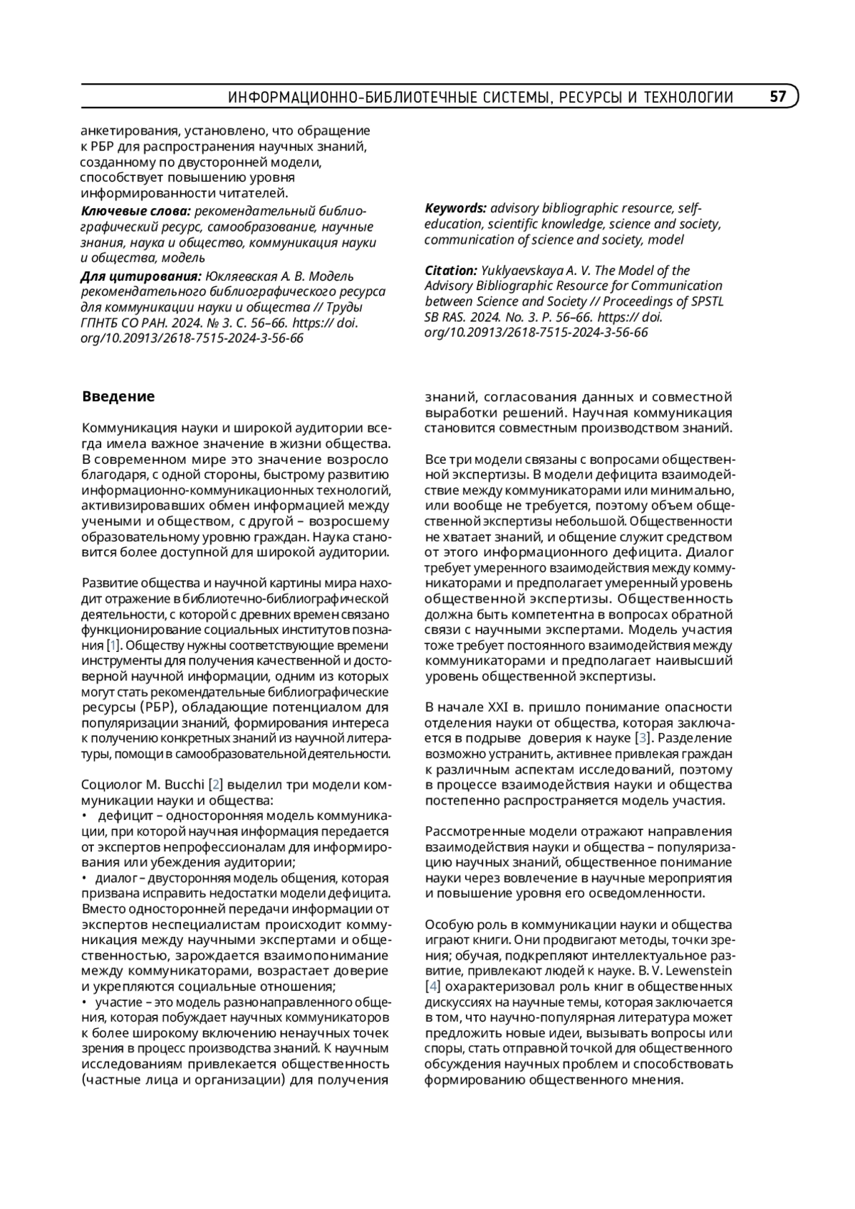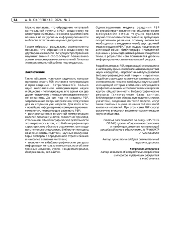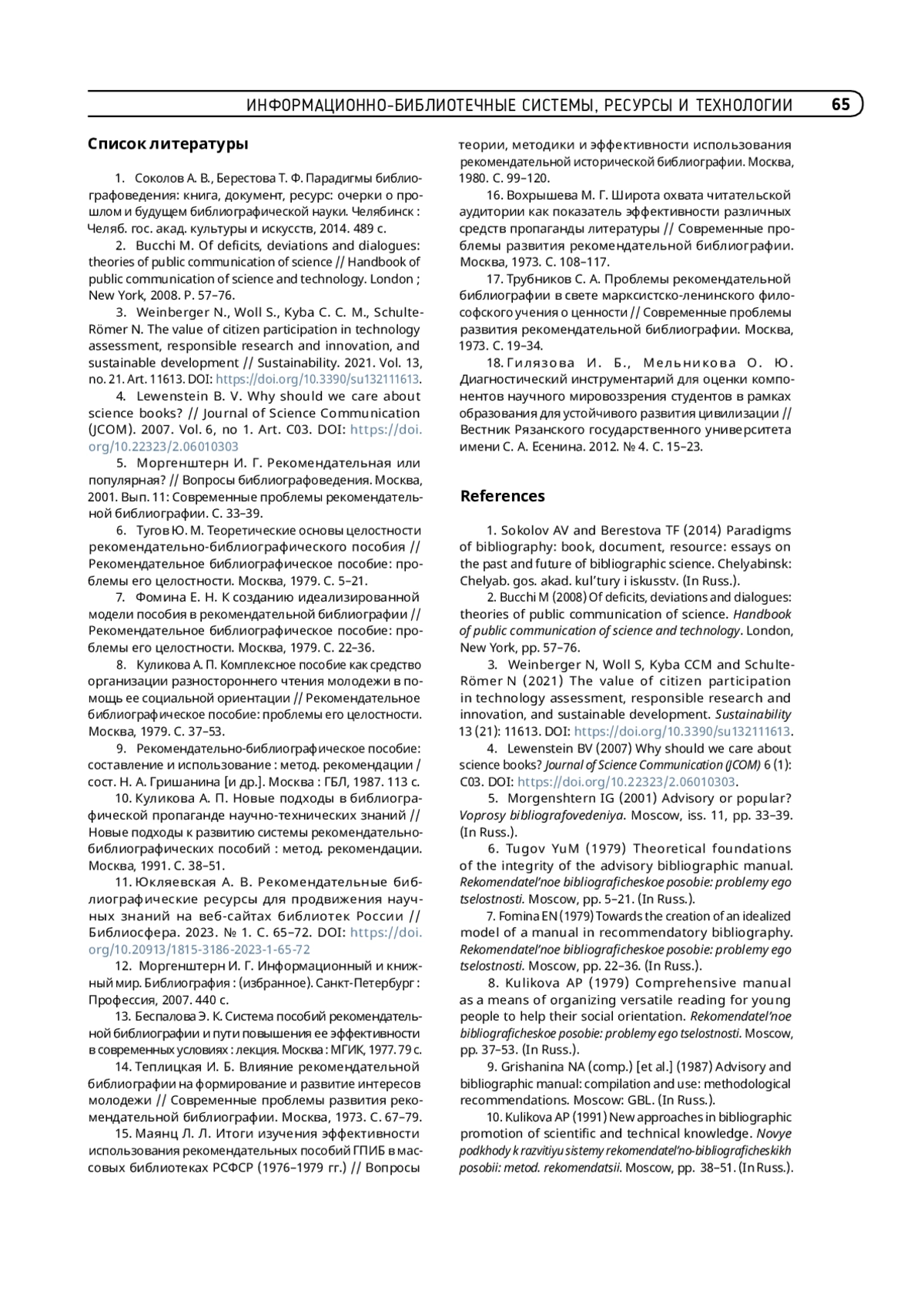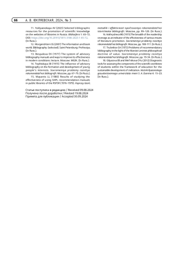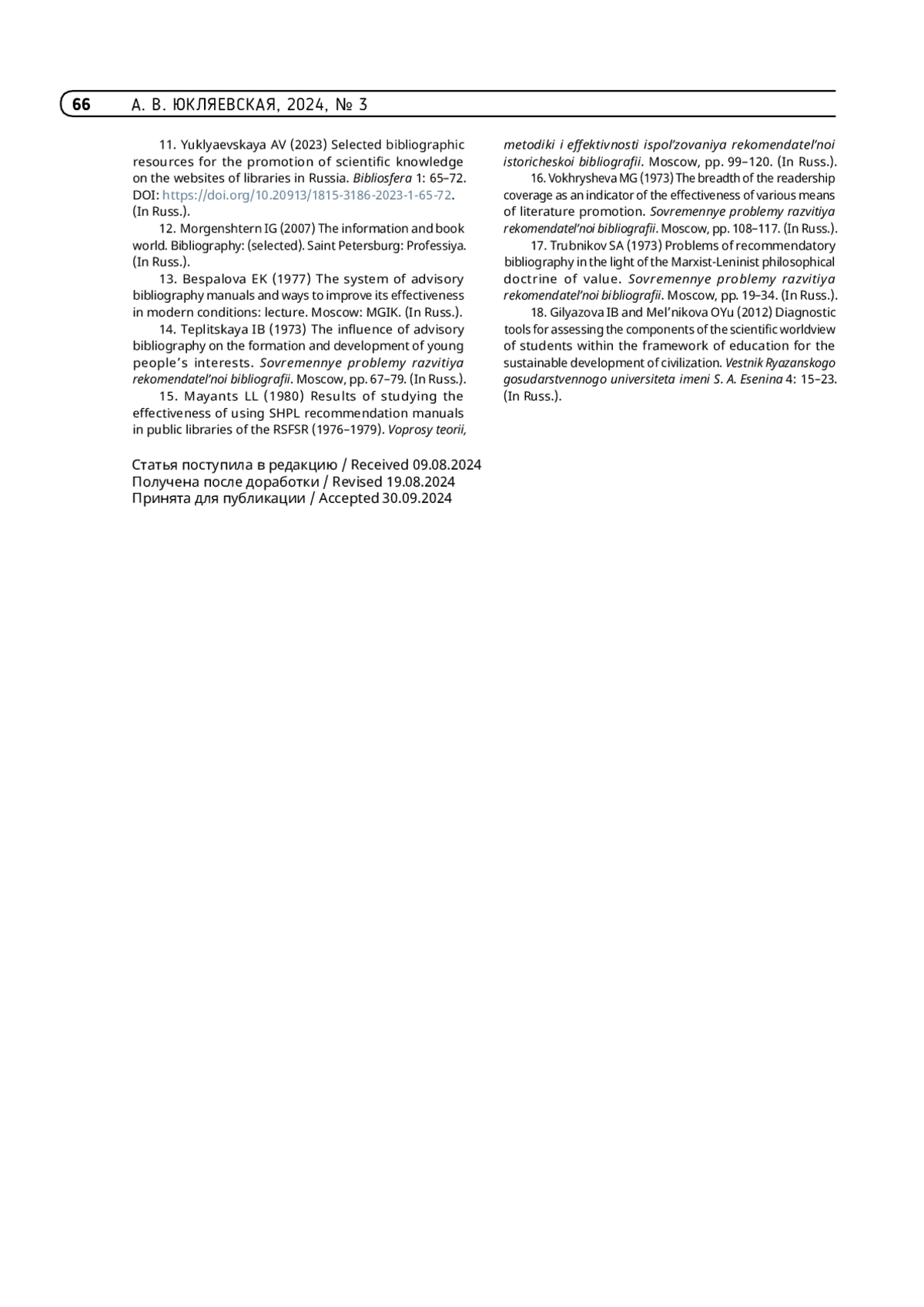 11. Юкляевская А. В. Рекомендательные библиографические ресурсы для продвижения научных знаний на веб-сайтах библиотек России // Библиосфера. 2023. № 1. С. 65-72. https://doi.org/10.20913/1815-3186-2023-1-65-72.
