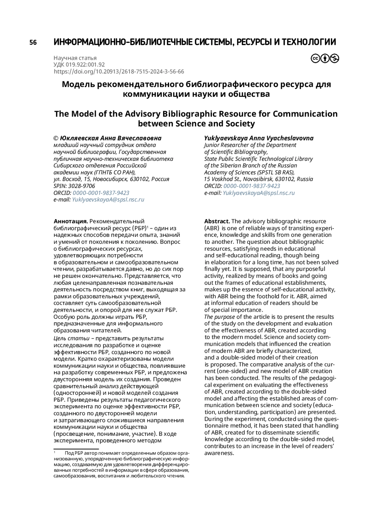 Цель статьи – представить результаты исследования по разработке и оценке эффективности РБР, созданного по новой модели. Кратко охарактеризованы модели коммуникации науки и общества, повлиявшие на разработку современных РБР, и предложена двусторонняя модель их создания. Проведен сравнительный анализ действующей (односторонней) и новой моделей создания РБР. Приведены результаты педагогического эксперимента по оценке эффективности РБР, созданного по двусторонней модели и затрагивающего сложившиеся направления коммуникации науки и общества (просвещение, понимание, участие). В ходе эксперимента, проведенного методом анкетирования, установлено, что обращение к РБР для распространения научных знаний, созданному по двусторонней модели, способствует повышению уровня информированности читателей.
