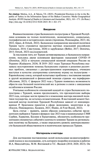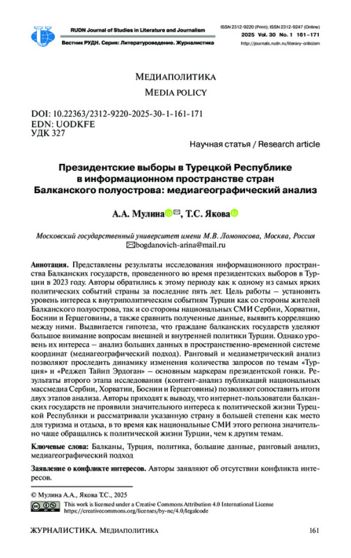 Цель работы - установить уровень интереса к внутриполитическим событиям Турции как со стороны жителей Балканского полуострова, так и со стороны национальных СМИ Сербии, Хорватии, Боснии и Герцеговины, а также сравнить полученные данные, выявить корреляцию между ними. Выдвигается гипотеза, что граждане балканских государств уделяют большое внимание вопросам внешней и внутренней политики Турции. Однако уровень их интереса - анализ больших данных в пространственно-временной системе координат (медиагеографический подход). Ранговый и медиаметрический анализ позволяют проследить динамику изменения количества запросов по темам «Турция» и «Реджеп Тайип Эрдоган» - основным маркерам президентской гонки. Результаты второго этапа исследования (контент-анализ публикаций национальных массмедиа Сербии, Хорватии, Боснии и Герцеговины) позволяют сопоставить итоги двух этапов анализа. Авторы приходят к выводу, что интернет-пользователи балканских государств не проявили значительного интереса к политической жизни Турецкой Республики и рассматривали указанную страну в большей степени как место для туризма и отдыха, в то время как национальные СМИ этого региона значительно чаще обращались к политической жизни Турции, чем к другим темам.