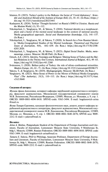 19. Ozturk A.E. Identity, Nostalgia and Religion: Making Sense of Turkey and the Balkan Relations in the Twenty-first Century // International Journal of Religion. 2023. Vol. 4. Issue 1. P. 49-65. DOI: 10.33182/ijor.v4i1.2260 EDN: DOTYGW