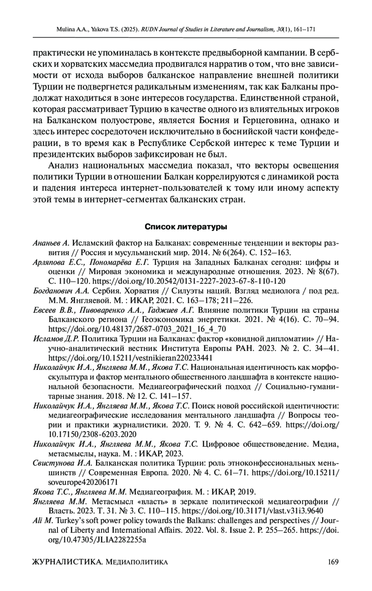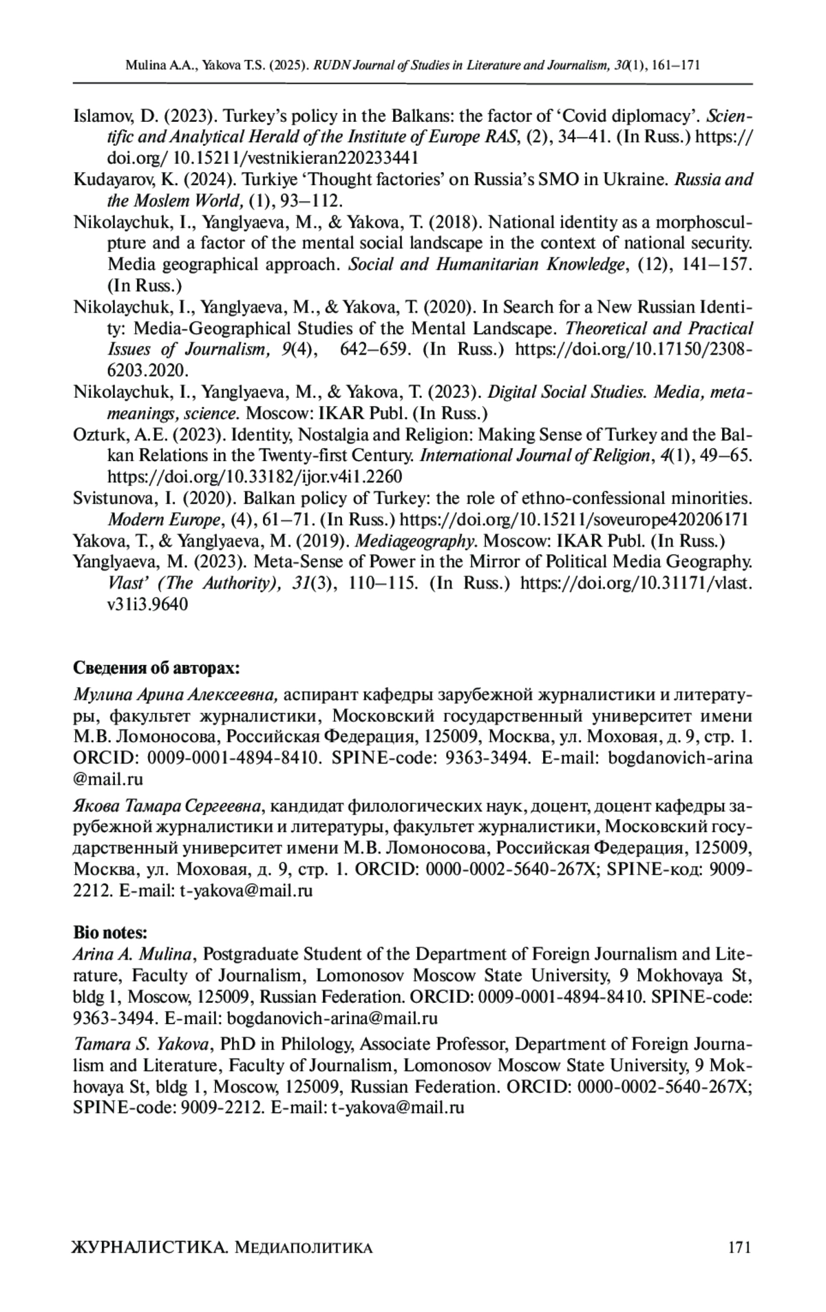 7. Николайчук И.А., Янгляева М.М., Якова Т.С. Поиск новой российской идентичности: медиагеографические исследования ментального ландшафта // Вопросы теории и практики журналистики. 2020. Т. 9. № 4. С. 642-659. DOI: 10.17150/2308-6203.2020 EDN: GNWSXV