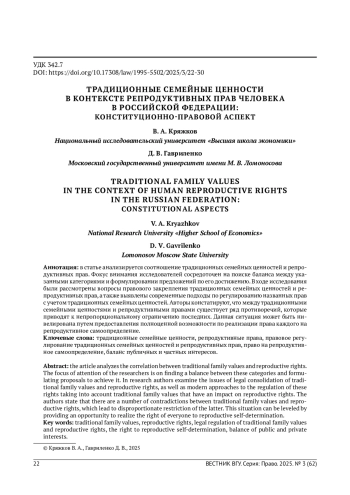 В статье анализируется соотношение традиционных семейных ценностей и репродуктивных прав. Фокус внимания исследователей сосредоточен на поиске баланса между указанными категориями и формулировании предложений по его достижению. В ходе исследования были рассмотрены вопросы правового закрепления традиционных семейных ценностей и репродуктивных прав, а также выявлены современные подходы по регулированию названных прав с учетом традиционных семейных ценностей. Авторы констатируют, что между традиционными семейными ценностями и репродуктивными правами существует ряд противоречий, которые приводят к непропорциональному ограничению последних. Данная ситуация может быть нивелирована путем предоставления полноценной возможности по реализации права каждого на репродуктивное самоопределение.