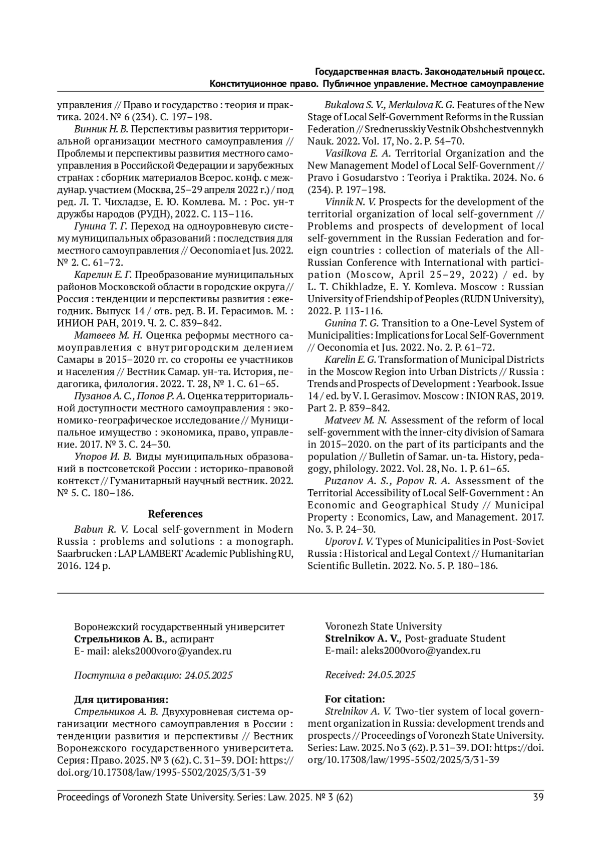 2. Букалова С. В., Меркулова К. Г. Особенности нового этапа реформирования местного самоуправления в Российской Федерации // Среднерусский вестник общественных наук. 2022. Т. 17, № 2. С. 54-70. EDN: RDZFPV