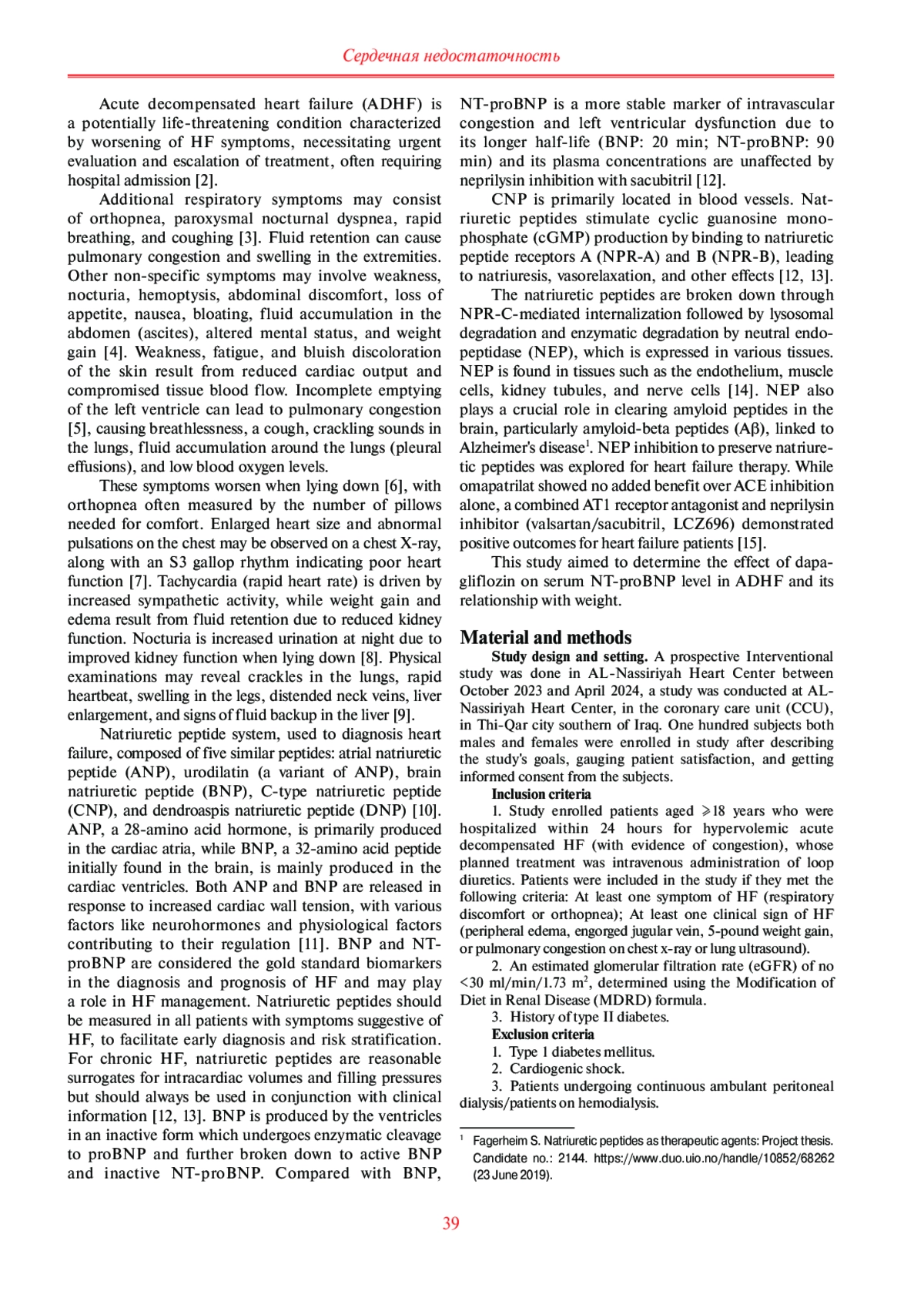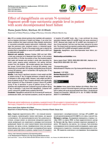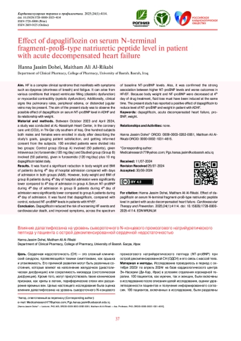 Цель. Сердечная недостаточность (СН) — это сложный клинический синдром, проявляющийся такими симптомами, как одышка и утомляемость. Его причиной развития могут быть различные состояния, которые влияют на наполнение желудочков (диастолическая дисфункция) или сократимость миокарда (систолическая дисфункция). Кроме того, могут присутствовать такие клинические признаки, как хрипы в легких, периферические отеки или расширение яремных вен. Целью настоящего исследования была оценка влияния дапаглифлозина на уровень сывороточного N-концевого промозгового натрийуретического пептида (NT-proBNP) при острой декомпенсированной СН (ОДСН) и его связь с массой тела.