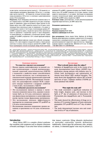 Заключение. Дапаглифлозин снижал риск событий, ассоциированных с СН, и риск сердечно-сосудистой смерти, а также улучшал симптомы по всему спектру исходных уровней NT-proBNP. Также была подтверждена сильная ассоциация между более высокими уровнями NT-proBNP и худшими исходами при СНнФВ. Поскольку масса тела и NT-proBNP снижались на 4-й день терапии, потеря жидкости происходила в то же время. Настоящее исследование показало положительный эффект дапаглифлозина на снижение уровня NT-proBNP и веса у пациентов с ОДСН.