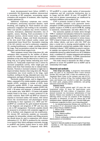 Aim. HF is a complex clinical syndrome that manifests with symptoms such as dyspnea (shortness of breath) and fatigue. It can arise from various conditions that impact ventricular filling (diastolic dysfunction) or myocardial contractility (systolic dysfunction). Additionally, clinical signs like pulmonary rales, peripheral edema, or distended jugular veins may be present. The aim of the present study was to observe the possible effect of dapagliflozin on serum NT-proBNP level in ADHF and its relationship with weight.