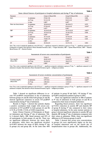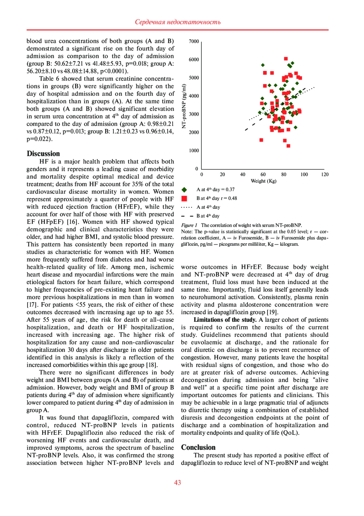 Результаты. Было обнаружено значительное снижение массы тела и индекса массы тела (ИМТ) пациентов на 4-й день госпитализации по сравнению с днем поступления в обеих группах (А и В). Однако масса тела и ИМТ пациентов группы B на 4-й день госпитализации были значительно ниже по сравнению с 4-м днем госпитализации в группе A. На 4-й день госпитализации уровень NTproBNP в сыворотке крови у пациентов группы B был значительно ниже по сравнению с пациентами группы A. Было обнаружено, что дапаглифлозин, по сравнению с контрольной группой, снижал уровень NT-proBNP у пациентов с СН с низкой фракцией выброса (СНнФВ).