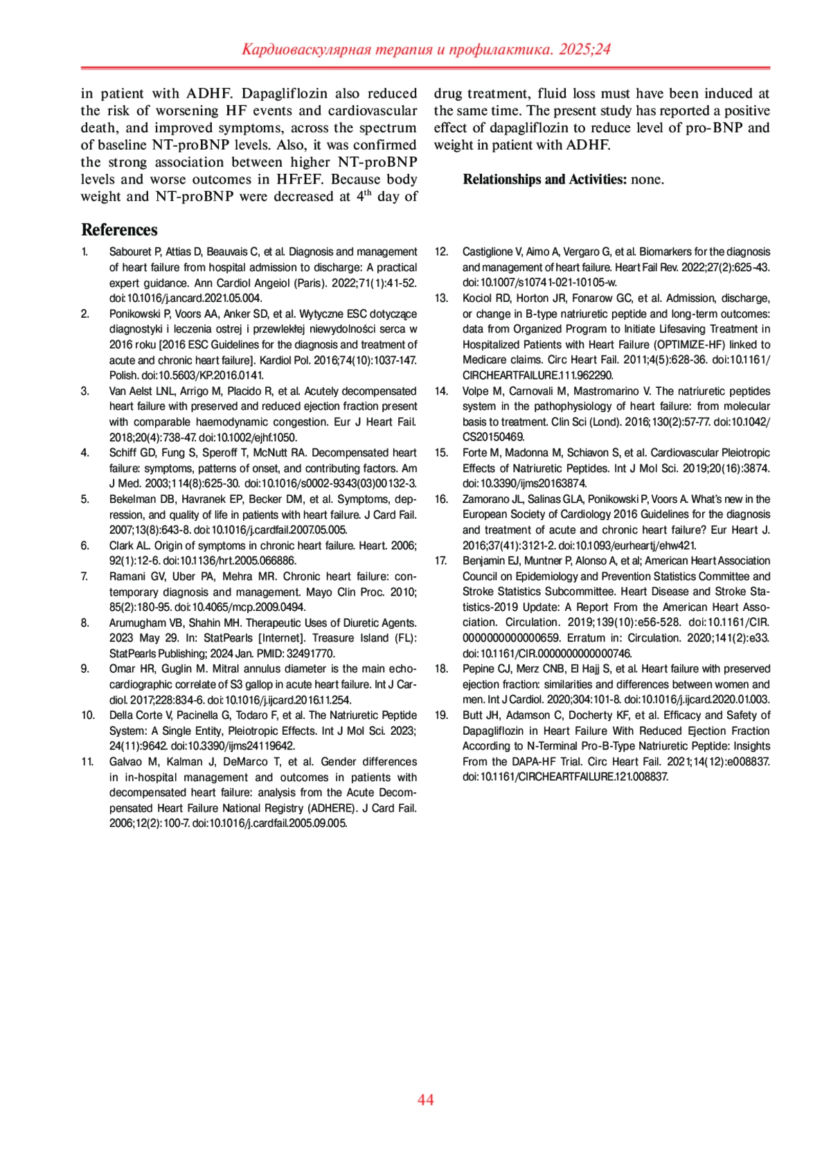 19. Батт Дж. Х., Адамсон К., Дочерти К. Ф. и др. Эффективность и безопасность дапаглифлозина при сердечной недостаточности со сниженной фракцией выброса по данным N-концевого промозгового натрийуретического пептида: результаты исследования DAPA-HF. Circ Heart Fail. 2021;14(12):e008837.