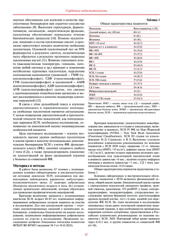 Цель. Оценить возможность исследования уровня свободных нуклеотидов в плазме крови в качестве дополнительных биомаркеров хронической сердечной недостаточности (ХСН) с учетом клинико-инструментальных данных пациента, а также проанализировать его изменение на фоне терапии.