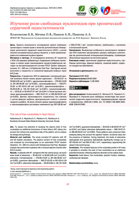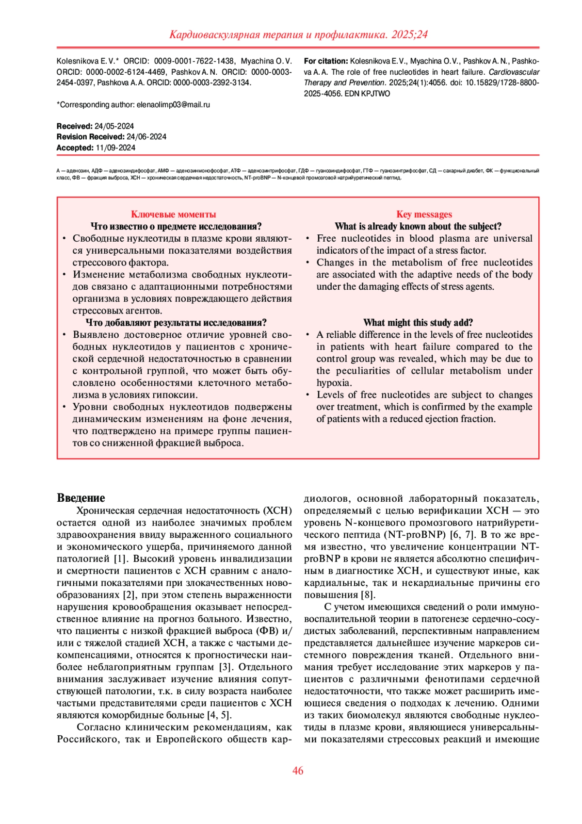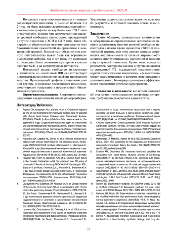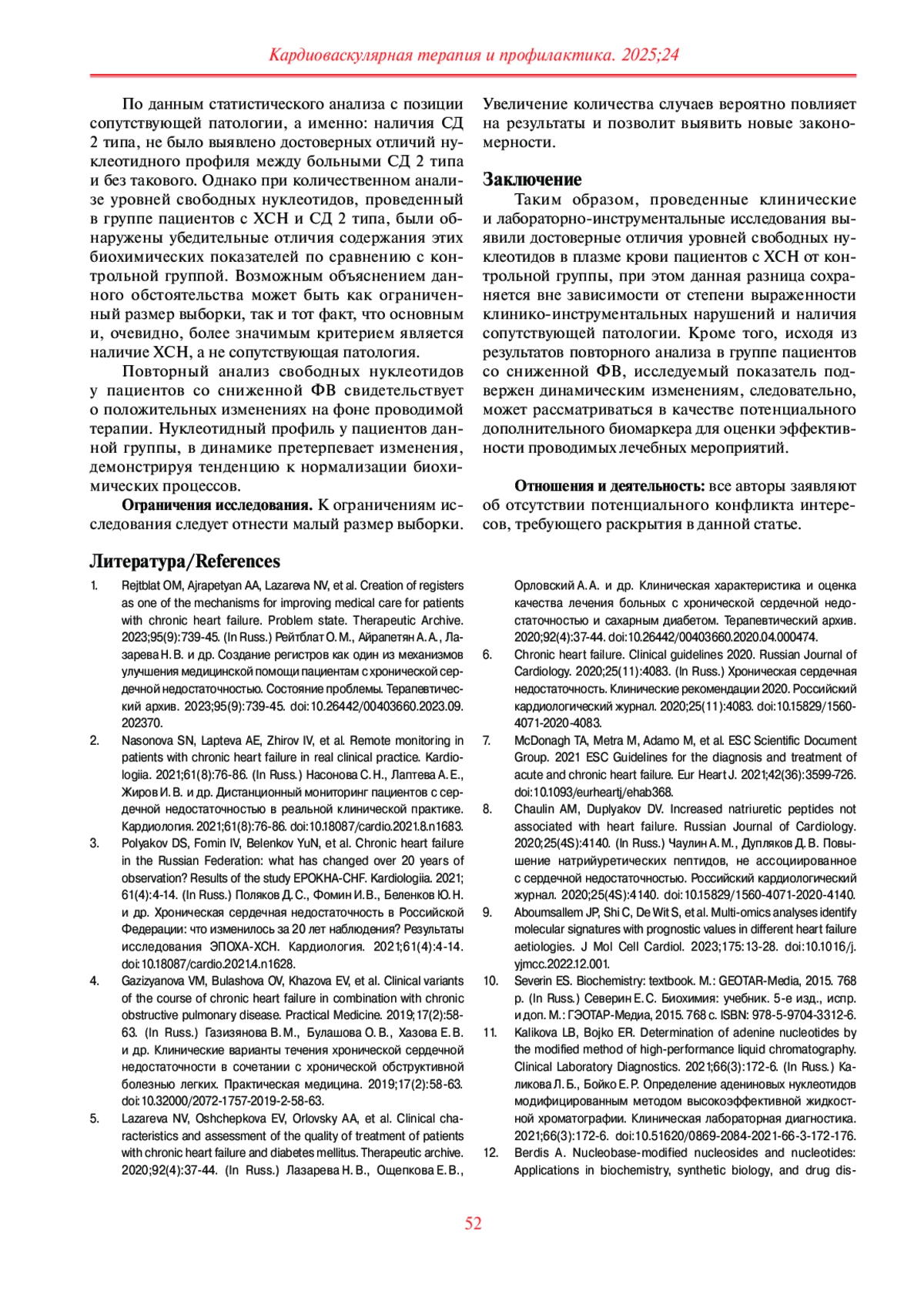 Заключение. Выявленные особенности нуклеотидного профиля при ХСН позволяют рассматривать уровень свободных нуклеотидов как дополнительный потенциальный биомаркер, отражающий объективные нарушения на клеточном уровне.