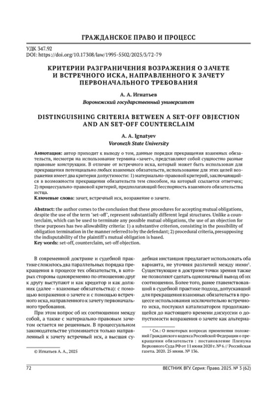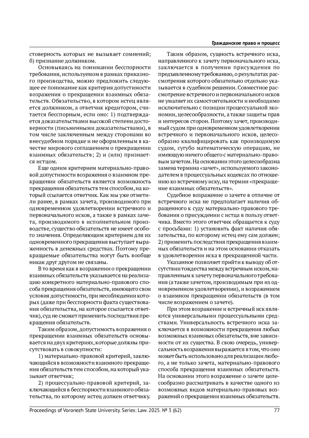 Автор приходит к выводу о том, данные порядки прекращения взаимных обязательств, несмотря на использование термина «зачет», представляют собой сущностно разные правовые конструкции. В отличие от встречного иска, который может быть использован для прекращения потенциально любых взаимных обязательств, использование для этих целей возражения имеет два критерия допустимости: 1) материально-правовой критерий, заключающийся в возможности прекращения обязательств тем способом, на который ссылается ответчик; 2) процессуально-правовой критерий, предполагающий бесспорность взаимного обязательства истца.
