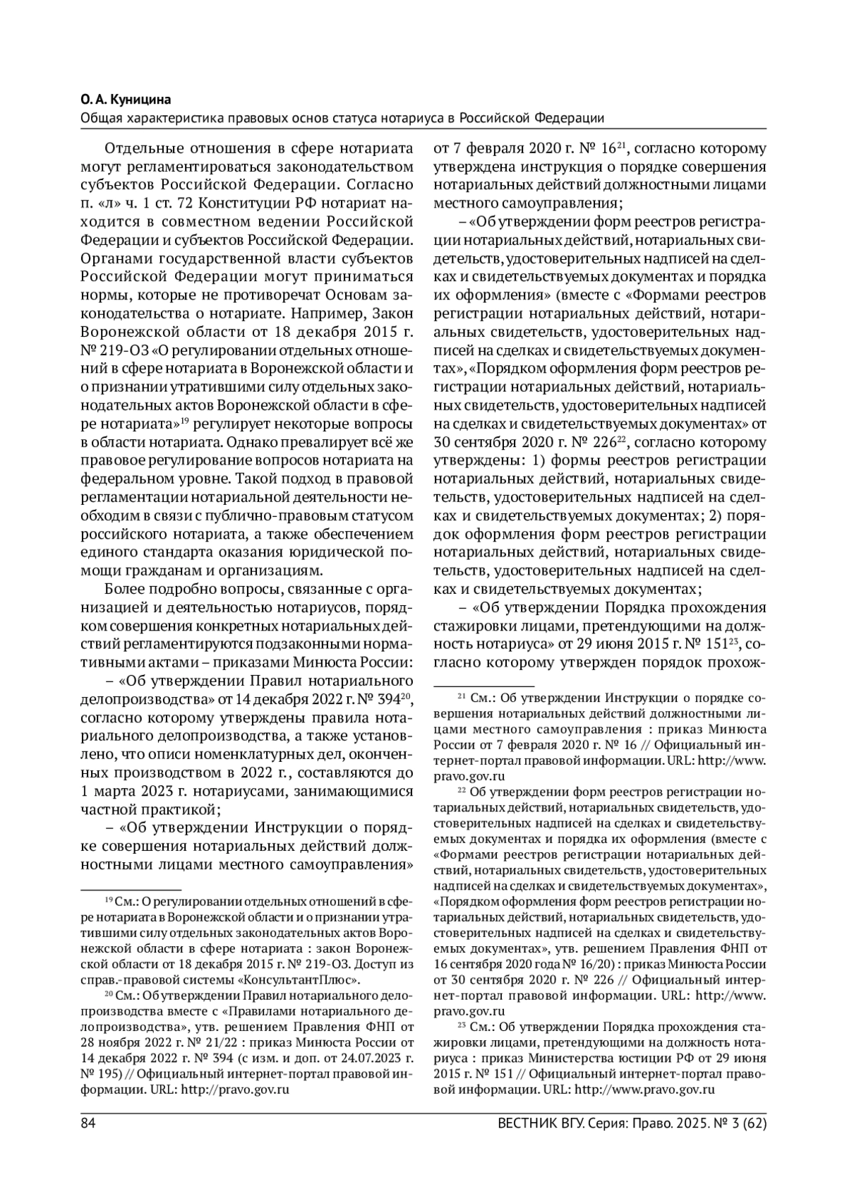 КУНИЦИНА О.А. ОБЩАЯ ХАРАКТЕРИСТИКА ПРАВОВЫХ ОСНОВ СТАТУСА НОТАРИУСА В РОССИЙСКОЙ ФЕДЕРАЦИИ // ВЕСТНИК ВОРОНЕЖСКОГО ГОСУДАРСТВЕННОГО УНИВЕРСИТЕТА. СЕРИЯ: ПРАВО. 2025. № 3 (62) (33 СТ.)