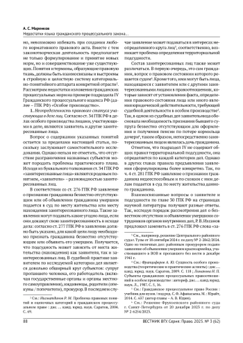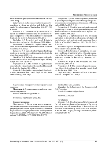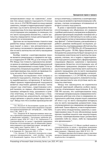 8. Закаряева М. М. Заинтересованные лица в делах о признании гражданина безвестно отсутствующим и объявлении умершим // Актуальные проблемы российского права. 2018. № 7 (92). С. 90-99. EDN: XXRZLN