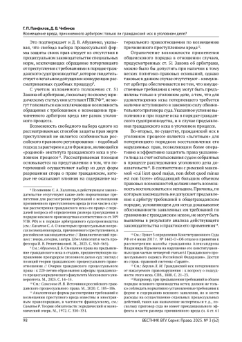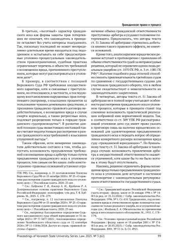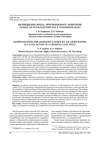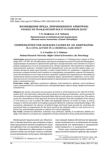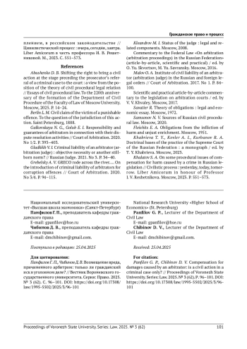 1. Абушенко Д. Б. Смещение права на предъявление гражданского иска в стадию, предшествующую направлению прокурором уголовного дела в суд: взгляд с позиций теории гражданского процессуального правоотношения // Очерки гражданского процессуального права: к 220-летию образования кафедры гражданского процесса юридического факультета Московского университета. М., 2025. С. 14-24. 2. Берлин Л. М. Гражданский иск потерпевшего от наказуемого правонарушения: к вопросу о подсудности этого иска. СПб., 1888. 3. Галковская Н. Г., Голуб Е. И. Ответственность и гарантии арбитров в связи с осуществлением ими деятельности по разрешению споров // Третейский суд. 2020. № 1/2. С. 393-403. 4. Гладких В. И. Уголовная ответственность арбитра (третейского судьи): объективная необходимость или еще одна мертворожденная норма? // Российский судья. 2021. № 3. С. 34-40. EDN: JJWNWG 5. Гребельский А. В. Ехал ГРЕКО через реку.. О введении уголовной ответственности арбитров за преступления коррупционной направленности // Третейский суд. 2020. № 3/4. С. 94-115. EDN: WDXHHD 6. Клеандров М. И. Статус судьи: правовой и смежные компоненты. М., 2008. EDN: SDQPGV 7. Комментарий к Федеральному закону “Об арбитраже (третейском разбирательстве) в Российской Федерации” (постатейный, научно-практический) / под ред. О. Ю. Скворцова, М. Ю. Савранского. М., 2016. 8. Малов О. А. Институт гражданско-правовой ответственности арбитра (третейского судьи) в российском и зарубежном правопорядках // Третейский суд. 2017. № 1. С. 84-100. EDN: YIEXWN 9. Научно-практический постатейный комментарий к законодательству о третейских судах / под общ. ред. В. В. Хвалея. М., 2017. 10. Саватье Р. Теория обязательств: юридический и экономический очерк. М., 1972. 11. Самсонов Н. В. Источники российского гражданского процессуального права. М., 2020. EDN: LNMWIM 12. Флейшиц Е. А. Обязательства из причинения вреда и неосновательного обогащения. М., 1951. 13. Хабриева Т. Я., Ковлер А. И., Курбанов Р. А. Доктринальные основы практики Верховного Суда Российской Федерации: монография / отв. ред. Т. Я. Хабриева. М., 2023. EDN: DLWAMW