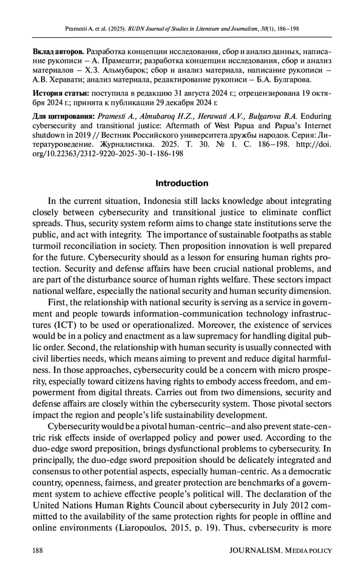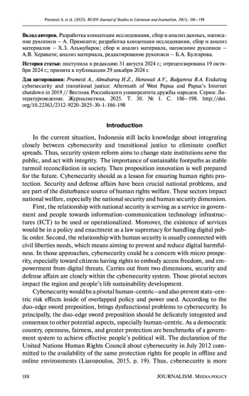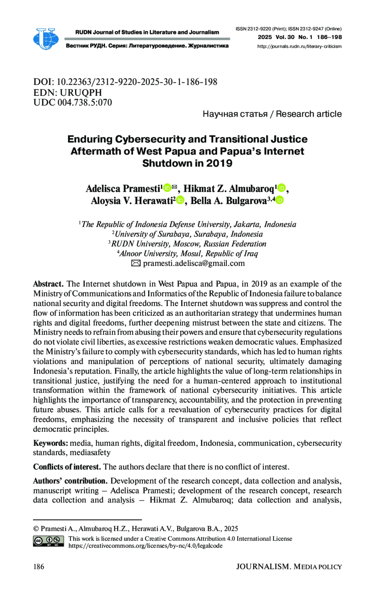 Отключение интернета в Западном Папуа и Новой Гвинее рассматривается как пример неспособности министерства связи и информатизации Республики Индонезия сбалансировать национальную безопасность и цифровые свободы. Отключение интернета подверглось критике как авторитарная стратегия, которая подрывает права человека и цифровые свободы, создавая и углубляя недоверие между государством и гражданами. Государству (в данном случае министерству) необходимо воздержаться от злоупотребления своими полномочиями и гарантировать, что правила кибербезопасности не нарушат гражданские свободы, поскольку чрезмерные ограничения ослабляют демократические ценности. Показывается несоблюдение государством (министерством) стандартов кибербезопасности, что привело к нарушениям прав человека и манипулированию восприятием национальной безопасности, а в конечном итоге нанесло ущерб репутации Индонезии. Подчеркивается ценность долгосрочных отношений в переходном правосудии, обосновывается необходимость подхода, ориентированного на человека, институциональной транс формации в рамках национальных инициатив по кибербезопасности, важность прозрачности, подотчетности и защиты в предотвращении будущих злоупотреблений. Авторы призывают к переоценке практик кибербезопасности для цифровых свобод, указывая на необходимость прозрачной и инклюзивной политики, отражающей демократические принципы.