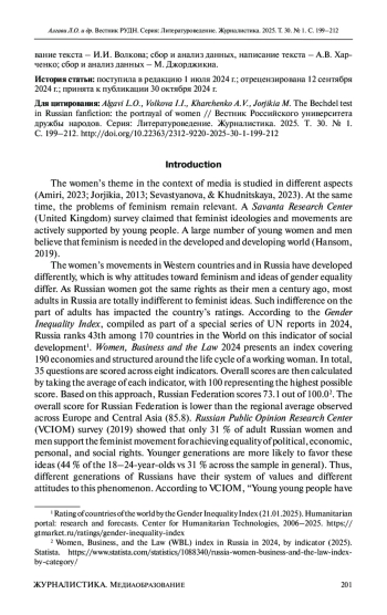 The women’s theme in the context of media is studied in different aspects (Amiri, 2023; Jorjikia, 2013; Sevastyanova, & Khudnitskaya, 2023). At the same time, the problems of feminism remain relevant. A Savanta Research Center (United Kingdom) survey claimed that feminist ideologies and movements are actively supported by young people.