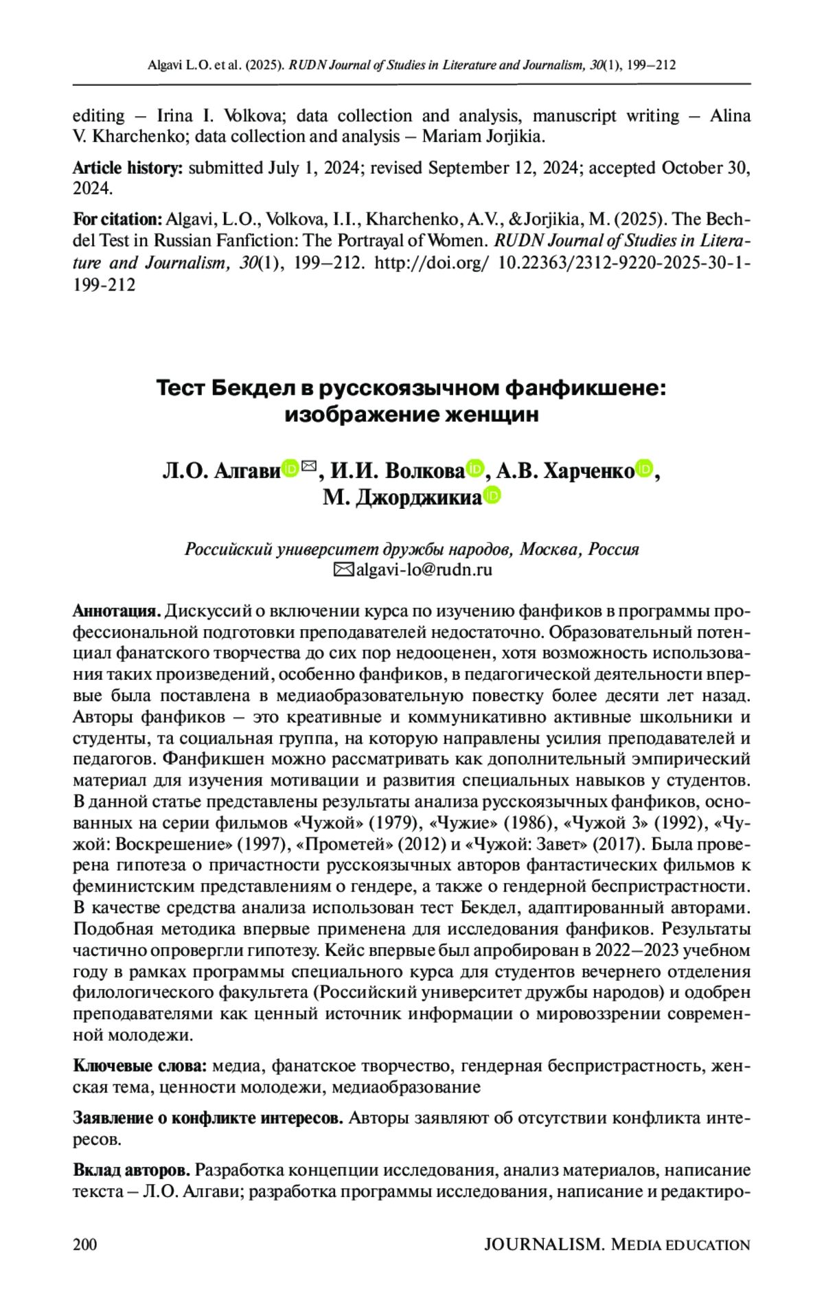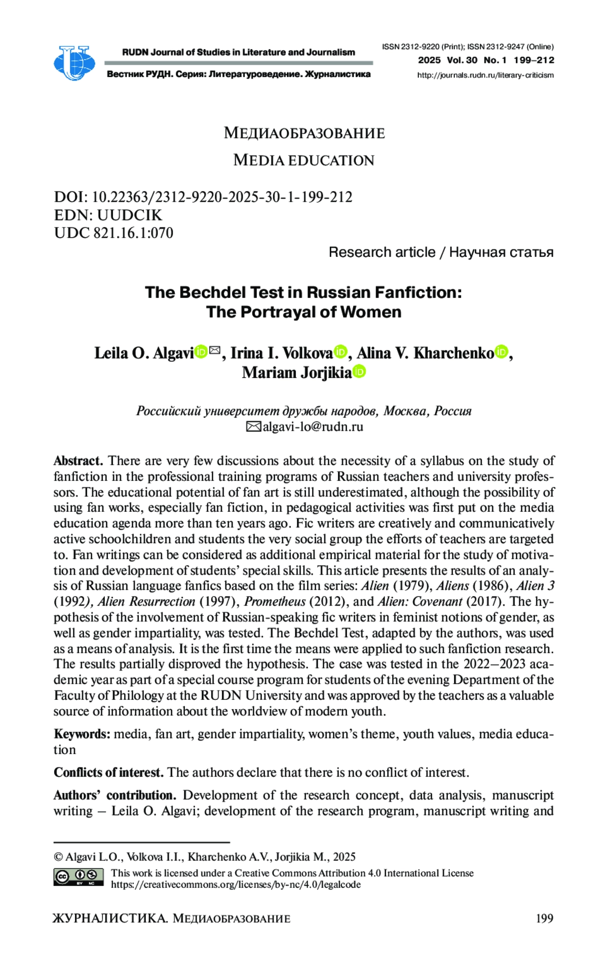 There are very few discussions about the necessity of a syllabus on the study of fanfiction in the professional training programs of Russian teachers and university professors. The educational potential of fan art is still underestimated, although the possibility of using fan works, especially fan fiction, in pedagogical activities was first put on the media education agenda more than ten years ago. Fic writers are creatively and communicatively active schoolchildren and students the very social group the efforts of teachers are targeted to. Fan writings can be considered as additional empirical material for the study of motivation and development of students’ special skills. This article presents the results of an analysis of Russian language fanfics based on the film series: Alien (1979), Aliens (1986), Alien 3 (1992), Alien Resurrection (1997), Prometheus (2012), and Alien: Covenant (2017). The hypothesis of the involvement of Russian-speaking fic writers in feminist notions of gender, as well as gender impartiality, was tested. The Bechdel Test, adapted by the authors, was used as a means of analysis. It is the first time the means were applied to such fanfiction research. The results partially disproved the hypothesis. The case was tested in the 2022-2023 academic year as part of a special course program for students of the evening Department of the Faculty of Philology at the RUDN University and was approved by the teachers as a valuable source of information about the worldview of modern youth.