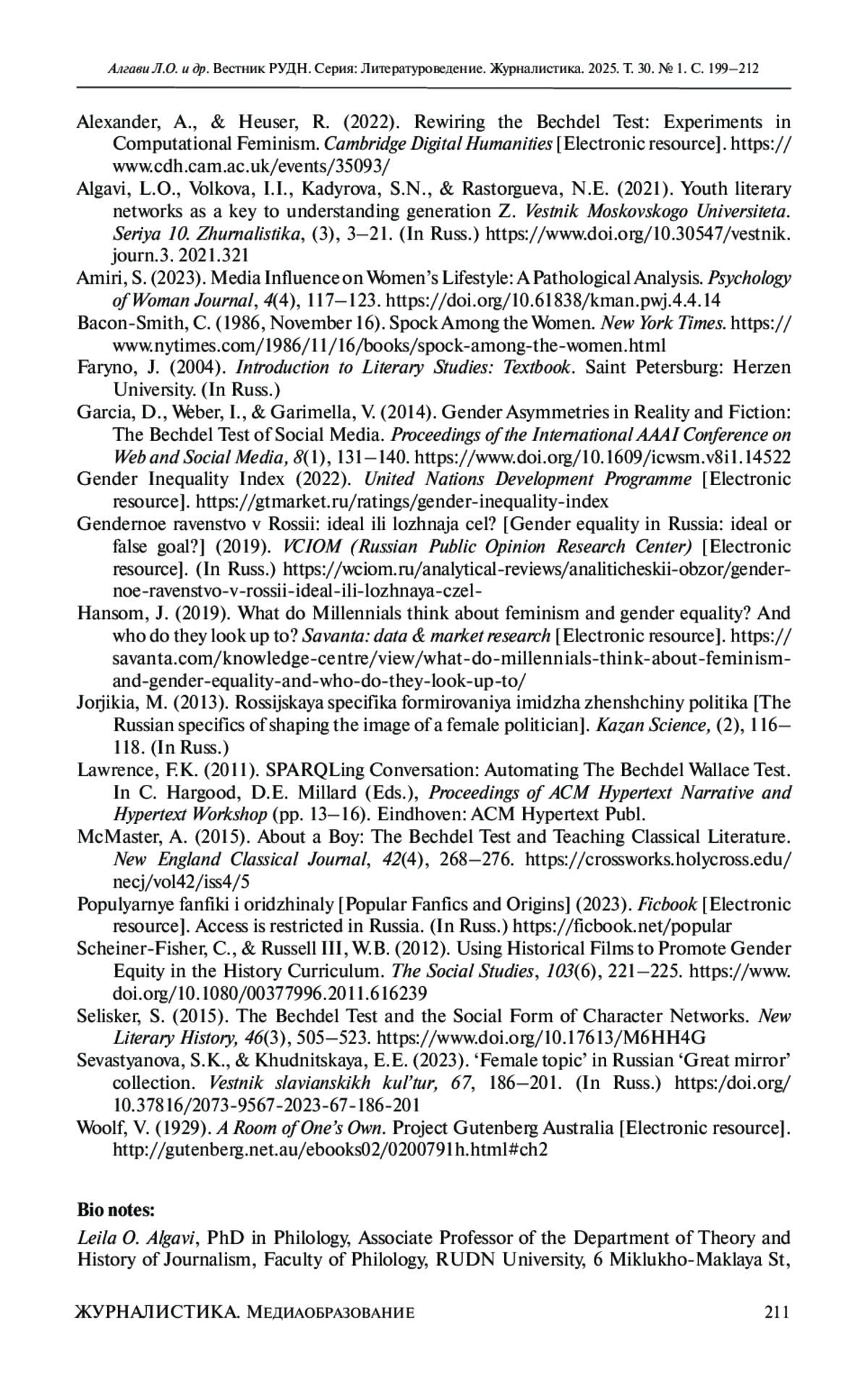 1. Abdullaeva, N.M. (2021). The Bechdel Test and Gender Equality in the Film Industry: The issues of an oversimplified analysis in assessing the representation of women in cinema. ABV Gender and Diversity Competence [Electronic resource]. https://blogs.fu-berlin.de/abv-gender-diversity/2021/12/13/the-bechdel-test-and-gender-equality-in-the-film-industry.