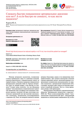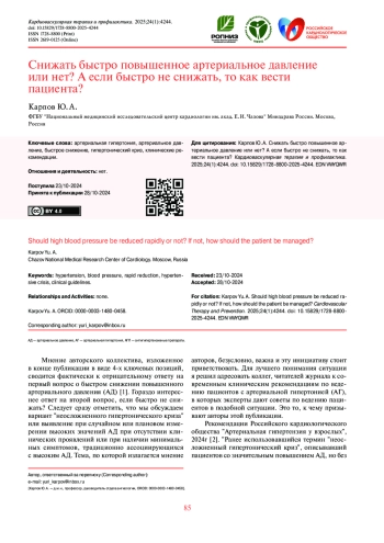 Мнение авторского коллектива, изложенное в конце публикации в виде 4-х ключевых позиций, сводится фактически к отрицательному ответу на первый вопрос о быстром снижении повышенного артериального давления (АД) [1]. Гораздо интереснее ответ на второй вопрос, если быстро не снижать? Следует сразу отметить, что мы обсуждаем вариант “неосложненного гипертонического криза” или выявление при случайном или плановом измерении высоких значений АД при отсутствии клинических проявлений или при наличии минимальных симптомов, традиционно ассоциирующихся с высоким АД. Тема, по которой излагается мнение авторов, безусловно, важна и эту инициативу стоит приветствовать. Для лучшего понимания ситуации я решил адресовать коллег, читателей журнала к современным клиническим рекомендациям по ведению пациентов с артериальной гипертонией (АГ), в которых эксперты дают советы по ведению пациентов в подобной ситуации. Это то, к чему призывают авторы этой публикации.