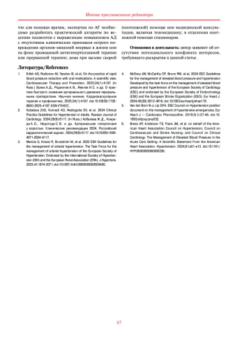 1. Эрлих А. Д., Родионов А. В., Явелов И. С. и др. О практике быстрого снижения артериального давления пероральными препаратами. Научное мнение. Кардиоваскулярная терапия и профилактика. 2025;24(1):4197. DOI: 10.15829/1728-8800-2025-4197