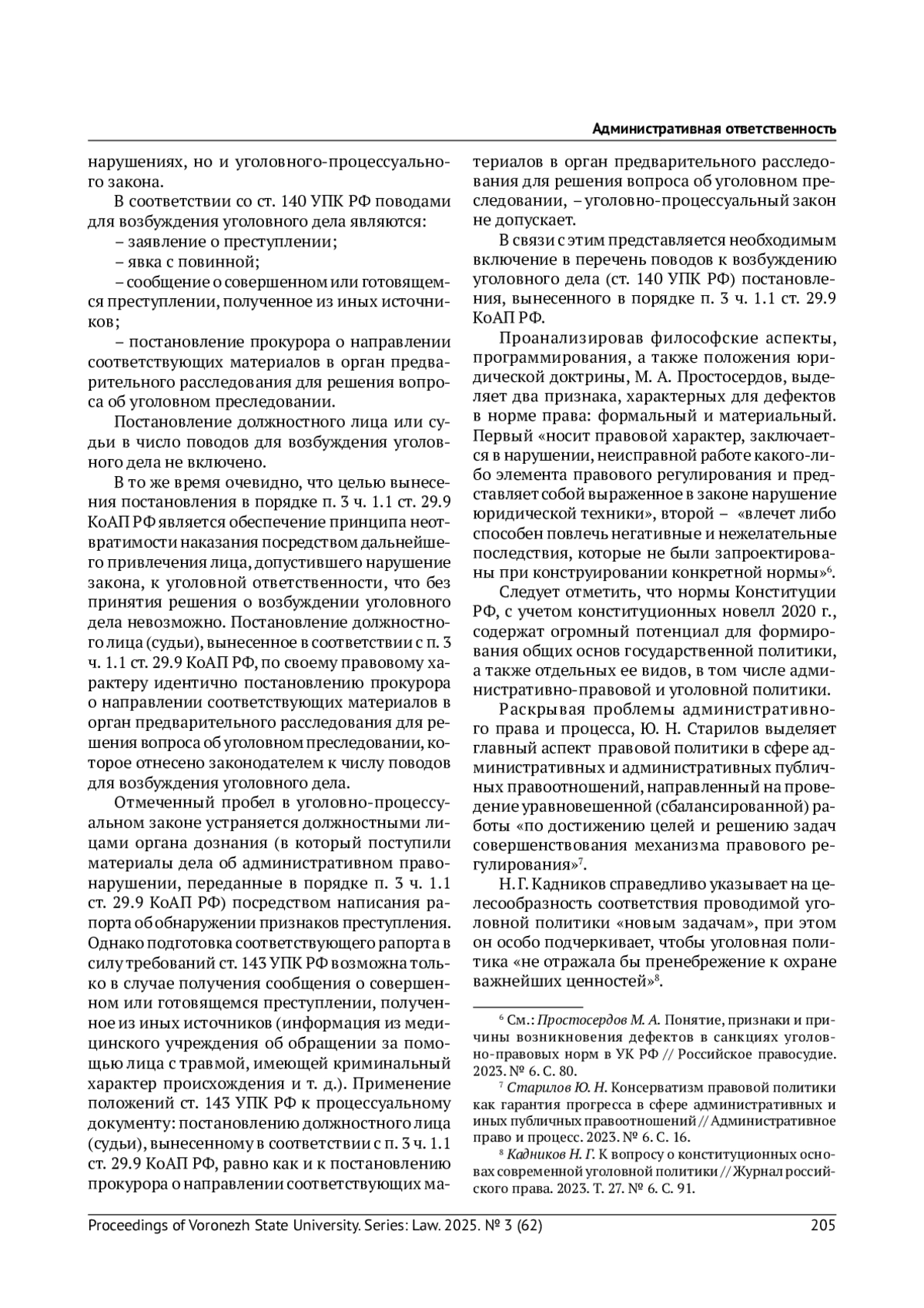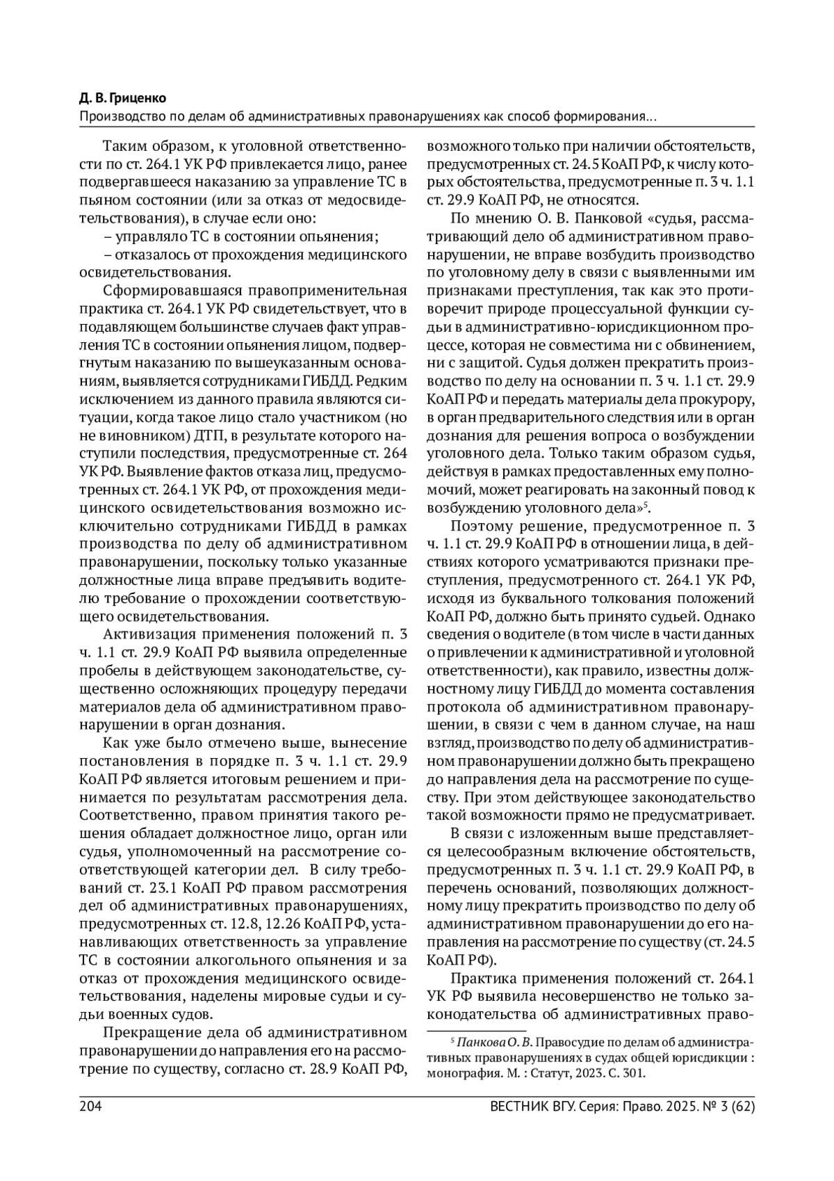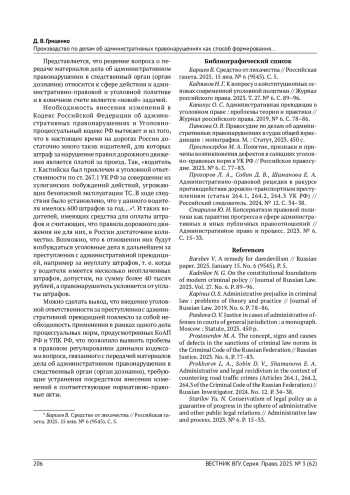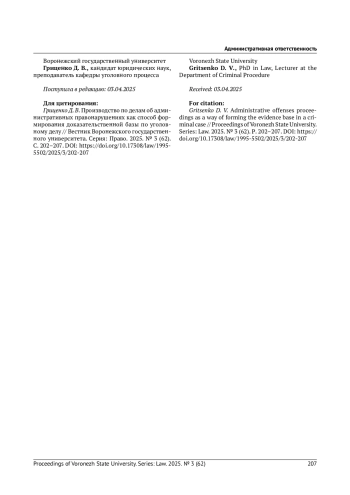ГРИЦЕНКО Д. В. ПРОИЗВОДСТВО ПО ДЕЛАМ ОБ АДМИНИСТРАТИВНЫХ ПРАВОНАРУШЕНИЯХ КАК СПОСОБ ФОРМИРОВАНИЯ ДОКАЗАТЕЛЬСТВЕННОЙ БАЗЫ ПО УГОЛОВНОМУ ДЕЛУ // ВЕСТНИК ВОРОНЕЖСКОГО ГОСУДАРСТВЕННОГО УНИВЕРСИТЕТА. СЕРИЯ: ПРАВО. 2025. № 3 (62) (33 СТ.)