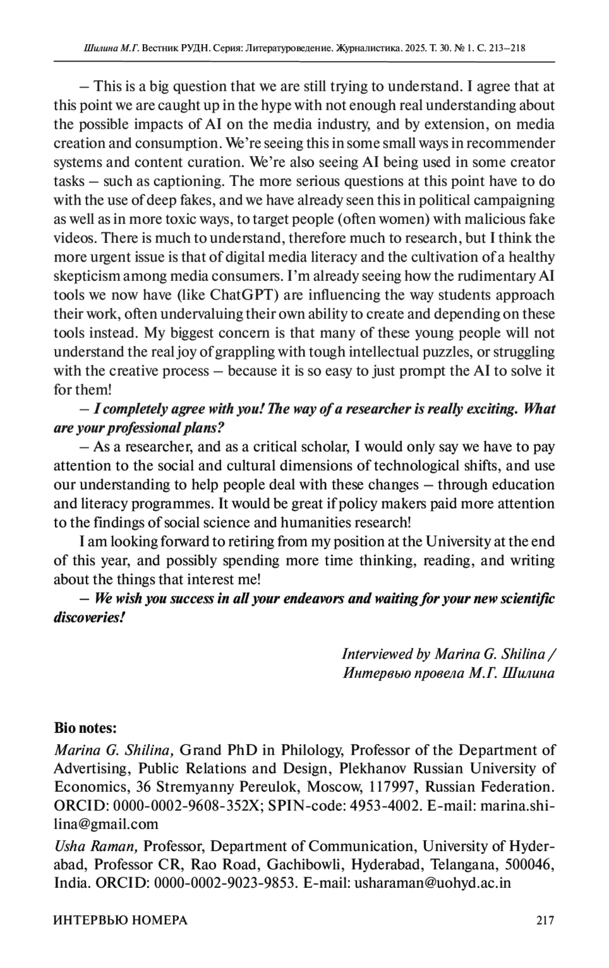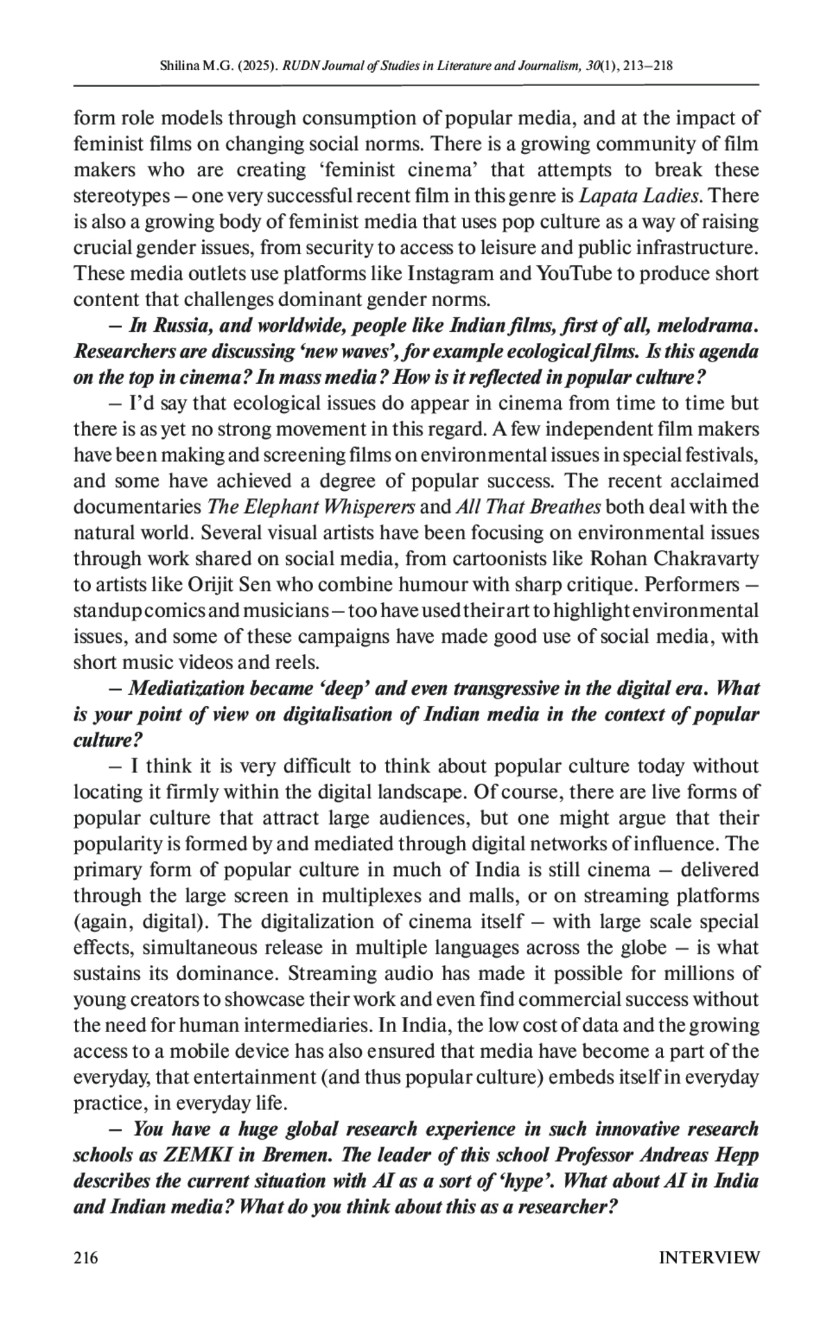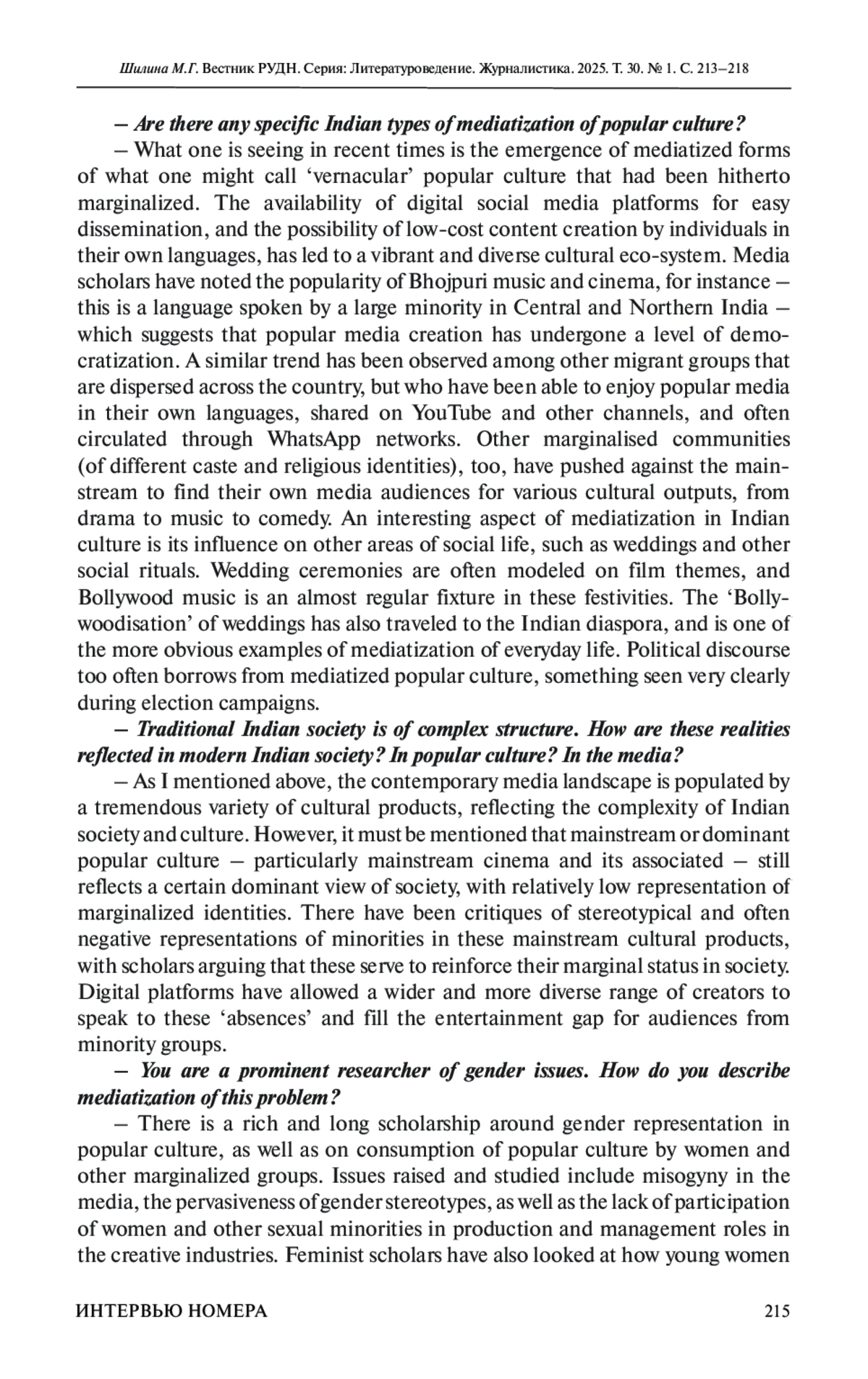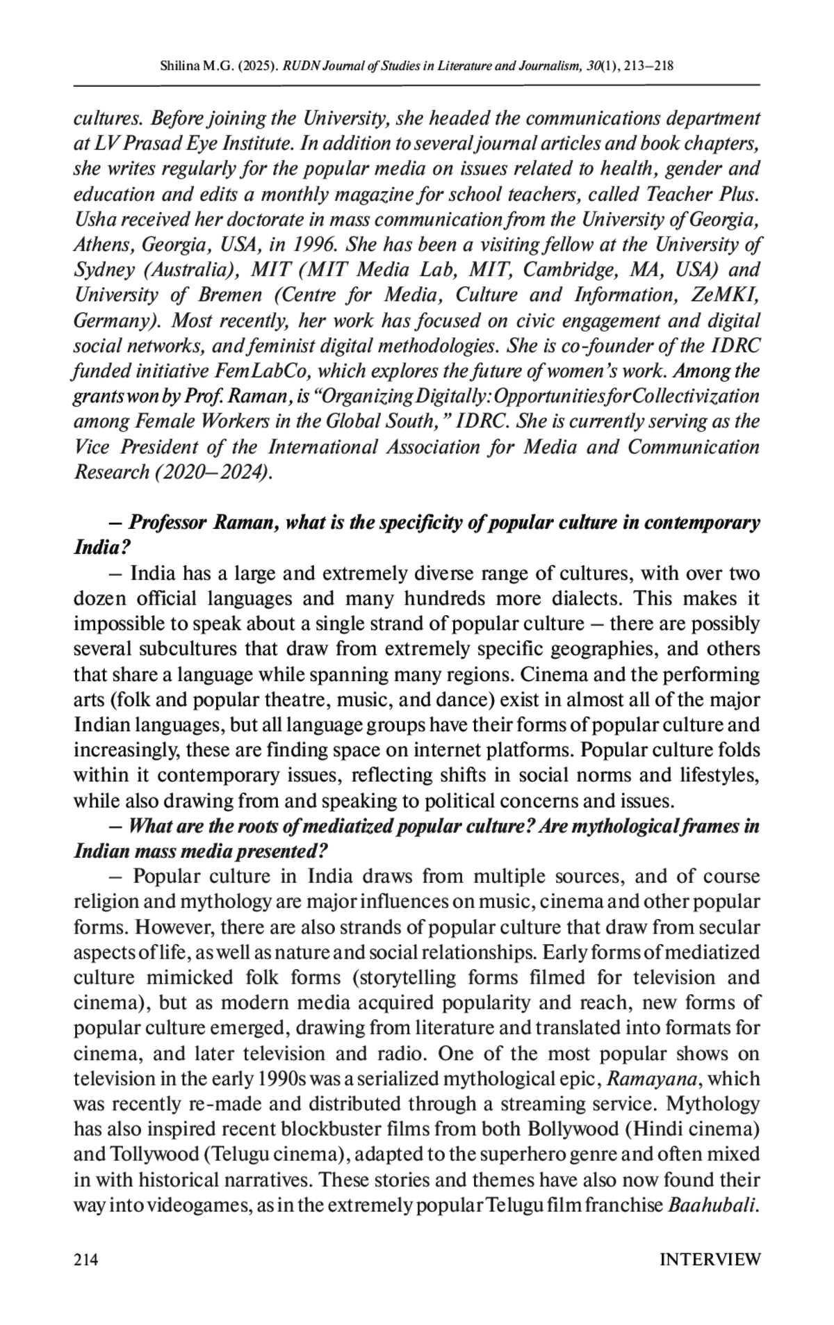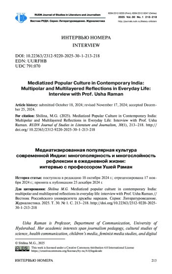 Shilina M. G. Mediatized popular culture in contemporary India: multipolar and multilayered reflections in everyday life: interview with Prof. Usha Raman // Вестник Российского университета дружбы народов. Серия: Литературоведение. Журналистика. 2025. Т. 30. № 1. С. 213–218. http://doi. org/10.22363/2312-9220-2025 30-1-213-218