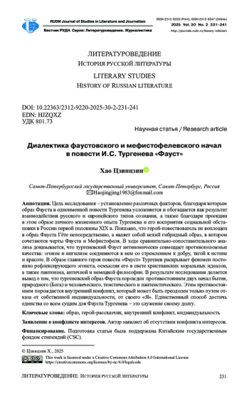 Цель исследования - установление различных факторов, благодаря которым образ Фауста в одноименной повести Тургенева усложняется и обогащается как результат взаимодействия русского и европейского типов сознания, а также благодаря проекции в этом образе личного жизненного опыта Тургенева и его восприятия социальной обстановки в России первой половины XIX в. Показано, что герой-повествователь не воплощен в образ Фауста Гёте непосредственно, а являет собой некий гибридный образ, в котором сочетаются черты Фауста и Мефистофеля. В ходе сравнительно-сопоставительного анализа доказывается, что тургеневский Фауст антиномически совмещает противоположные качества: эгоизм и нигилизм соединяются в нем со стремлением к добру, тягой к истине и красоте. В образе главного героя повести «Фауст» Тургенев раскрывает феномен постоянно рефлексирующего эгоиста, осмысляя его в свете христианских моральных идеалов, а также пантеизма, античной и немецкой философии. В результате исследования делается вывод о том, что тургеневский образ Фауста порожден противостоянием двух начал бытия, природного (Бога) и человеческого, теистического и пантеистического. Этим противостоянием порождается внутренний конфликт, который может быть преодолен только путем отказа от собственной индивидуальности, от своего «я». Единственный способ достичь единства со всем сущим для Фауста Тургенева - это служение своему долгу.
