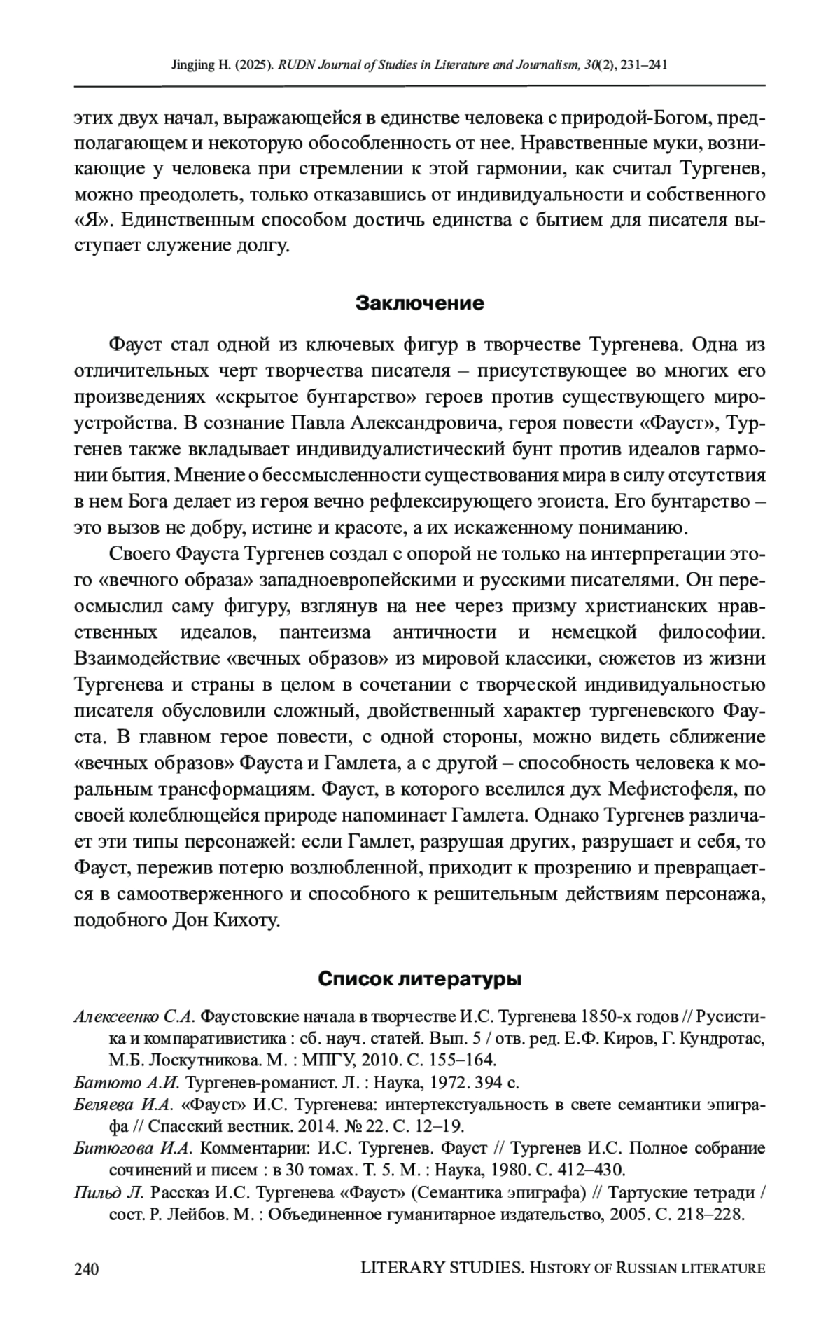 1. Алексеенко С.А. Фаустовские начала в творчестве И.С. Тургенева 1850-х годов // Русистика и компаративистика: сб. науч. статей. Вып. 5 / отв. ред. Е.Ф. Киров, Г. Кундротас, М.Б. Лоскутникова. М.: МПГУ, 2010. С. 155-164. EDN: UWGIWV