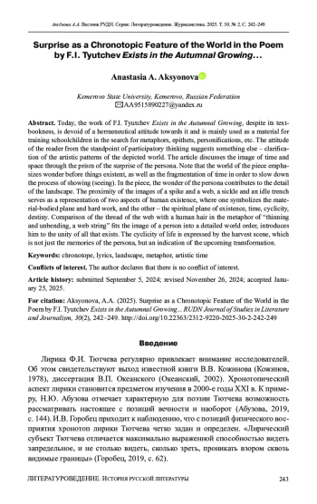 Сегодня произведение Ф. И. Тютчева «Есть в осени первоначальной…» лишено герменевтического отношения, несмотря на свою хрестоматийность. В основном оно используется как материал для тренировки школьников в поиске метафор, эпитетов, олицетворений и т. д. Отношение читателя с позиций участного мышления предполагает нечто другое - прояснение художественных закономерностей изображенного мира. Цель исследования - выяснение функциональной роли удивления как особой мыслительноэмоцио нальной «операции» в работе автора с материалом. Показано, что благодаря ему происходит дробление художественного времени и одновременно его замедление. В результате изображаемый пейзаж приобретает более детальный характер, автор приходит к выводу об особом антиномическом способе мышления поэта, благодаря которому тонко выписанные детали картины природы становятся воплощением философской идеи о единстве двух аспектов человеческого существования - духовного и материального. Сравнение нити паутины с человеческим волосом в метафоре «паутины тонкий волос» вписывает образ человека в детализированный миропорядок, приобщает его к единству всего сущего. Цикличность жизни выражается сценой жатвы, которая представляет собой не просто воспоминания лирического героя, а указание на грядущую трансформацию.