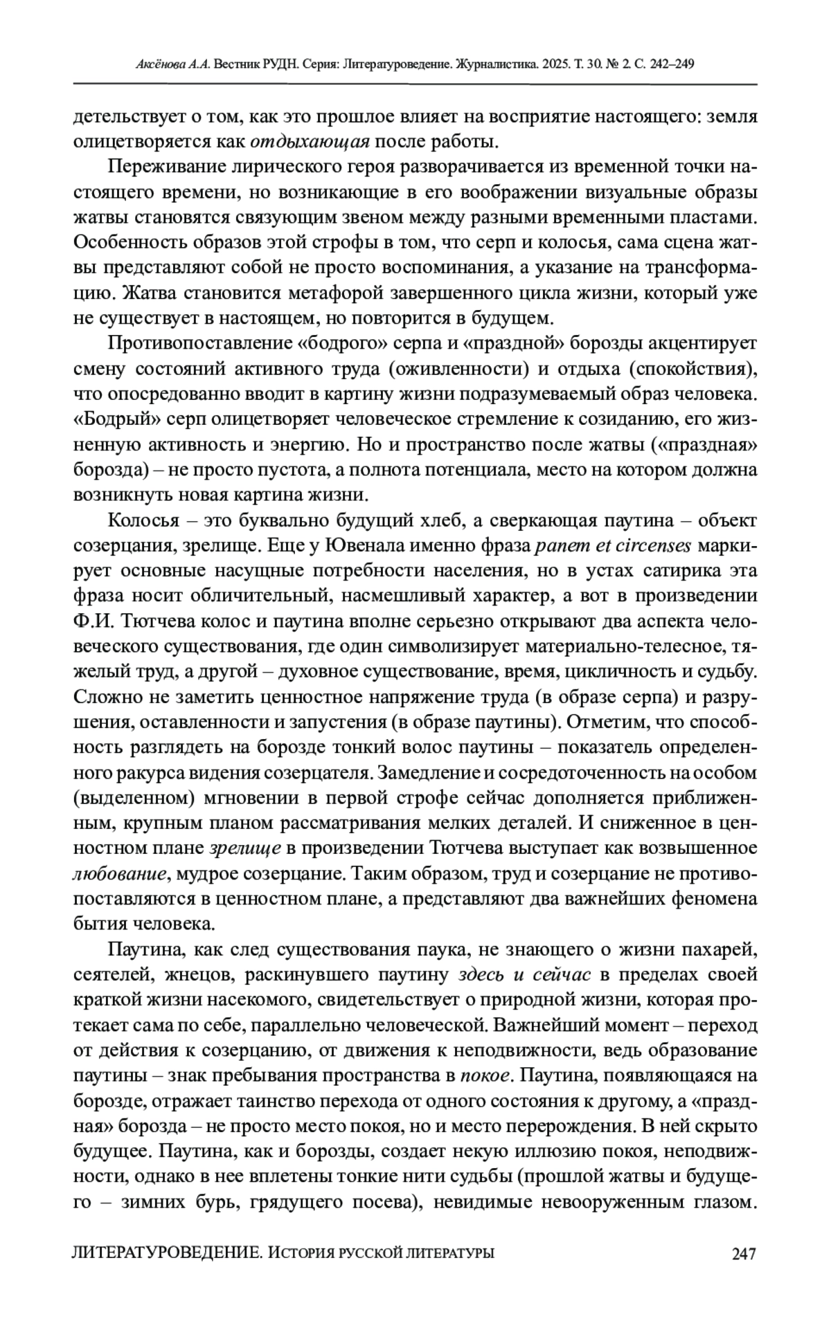 Цель исследования - выяснение функциональной роли удивления как особой мыслительноэмоциональной «операции» в работе автора с материалом. Показано, что благодаря ему происходит дробление художественного времени и одновременно его замедление. В результате изображаемый пейзаж приобретает более детальный характер, автор приходит к выводу об особом антиномическом способе мышления поэта, благодаря которому тонко выписанные детали картины природы становятся воплощением философской идеи о единстве двух аспектов человеческого существования - духовного и материального. Сравнение нити паутины с человеческим волосом в метафоре «паутины тонкий волос» вписывает образ человека в детализированный миропорядок, приобщает его к единству всего сущего. Цикличность жизни выражается сценой жатвы, которая представляет собой не просто воспоминания лирического героя, а указание на грядущую трансформацию.