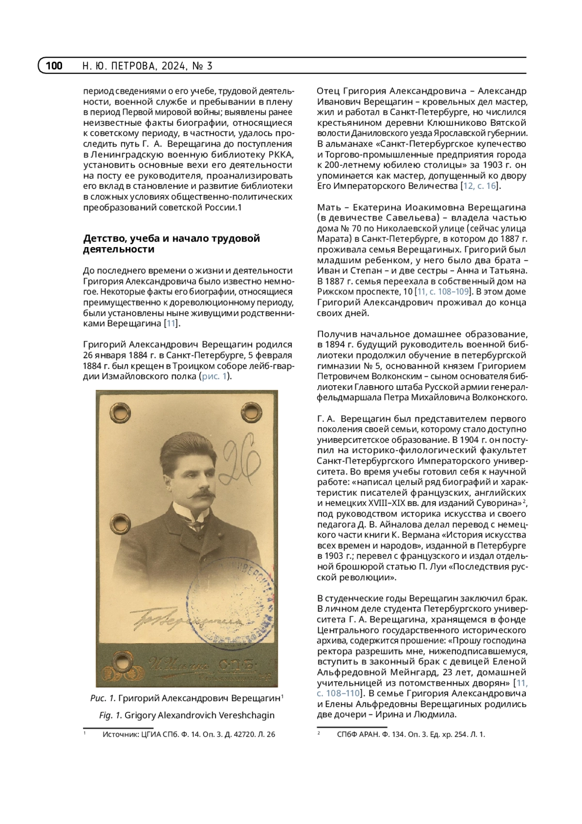 В результате анализа широкой источниковой базы установлены неизвестные ранее факты жизни Г. А. Верещагина, относящиеся к его учебе, военной службе, деятельности на посту руководителя Ленинградской военной библиотеки РККА, раскрыты некоторые аспекты истории возглавляемой им библиотеки: сроки и порядок проведения ее реорганизаций в 1924–1932 гг., источники пополнения фонда, важнейшими из которых стали Государственный книжный фонд и обязательный экземпляр военной литературы, поступавший в библиотеку в 1925–1930 гг.