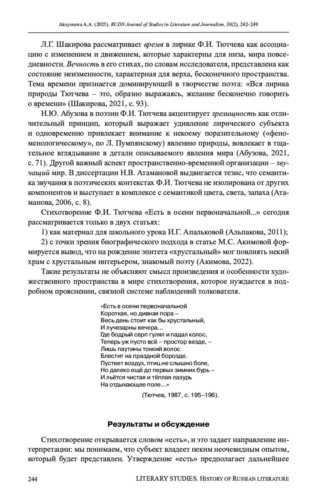 АКСЁНОВА А. А. УДИВЛЕНИЕ КАК ХРОНОТОПИЧЕСКАЯ ОСОБЕННОСТЬ МИРА В СТИХОТВОРЕНИИ Ф. И. ТЮТЧЕВА «ЕСТЬ В ОСЕНИ ПЕРВОНАЧАЛЬНОЙ...» // ВЕСТНИК РОССИЙСКОГО УНИВЕРСИТЕТА ДРУЖБЫ НАРОДОВ. СЕРИЯ: ЛИТЕРАТУРОВЕДЕНИЕ. ЖУРНАЛИСТИКА. 2025. ТОМ 30 № 2
