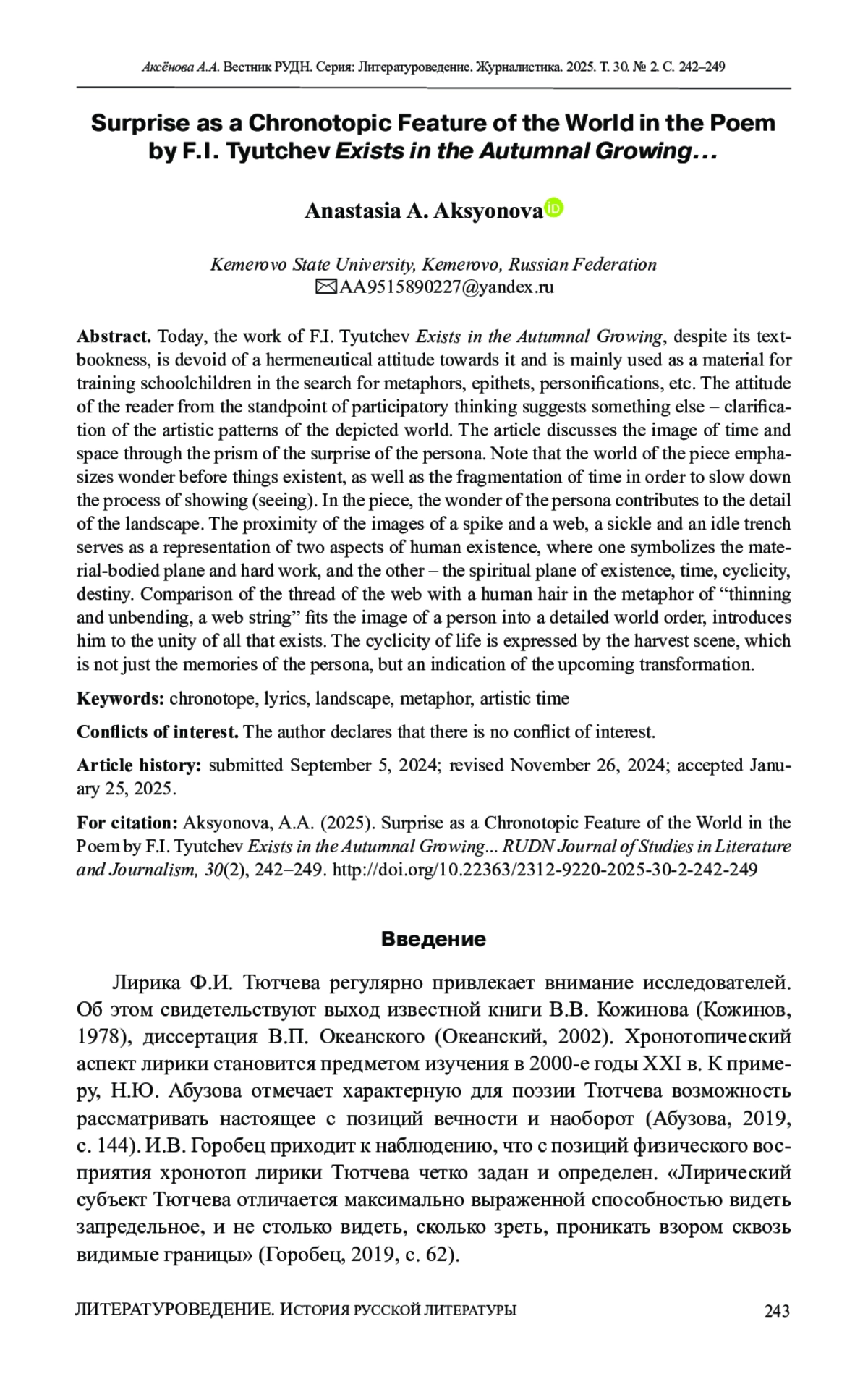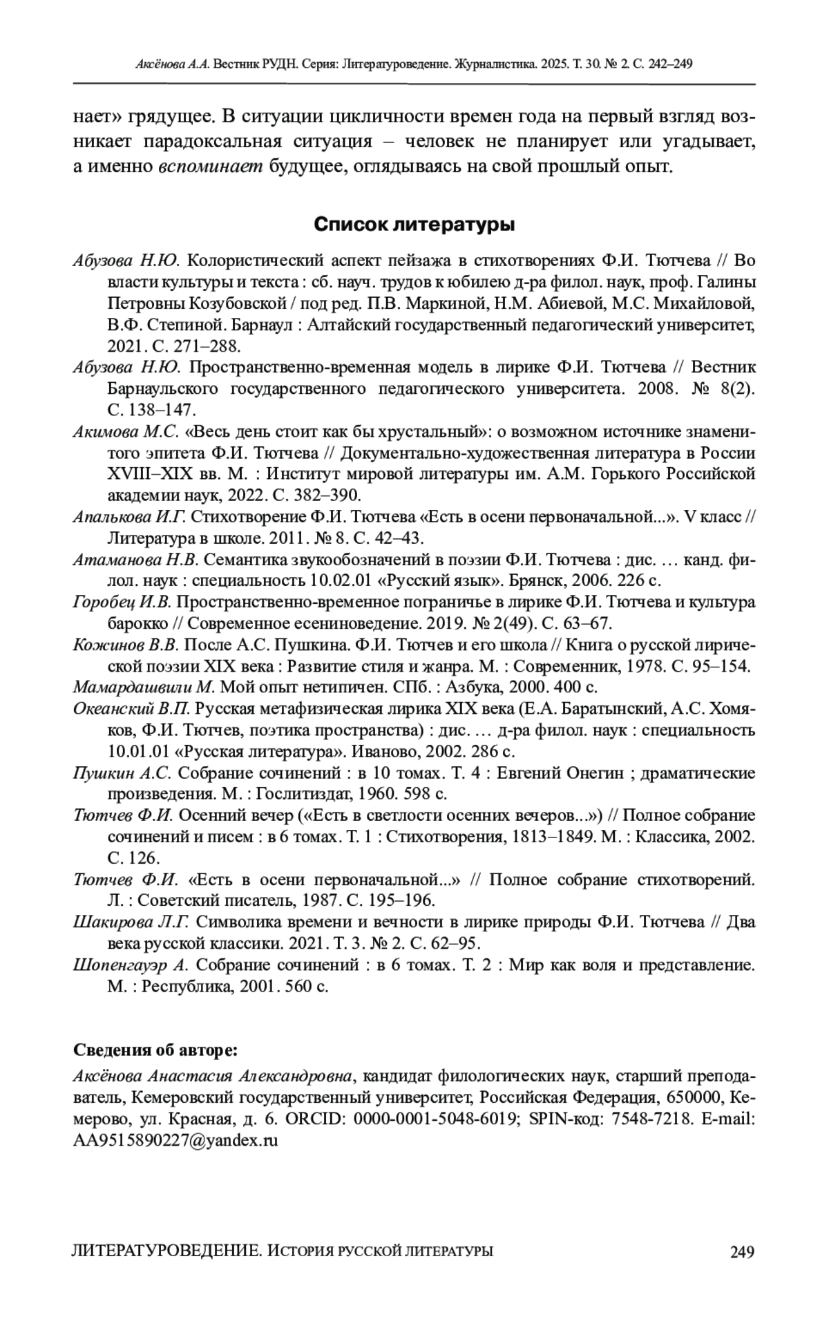 2. Абузова Н.Ю. Пространственно-временная модель в лирике Ф.И. Тютчева // Вестник Барнаульского государственного педагогического университета. 2008. № 8(2). С. 138-147.