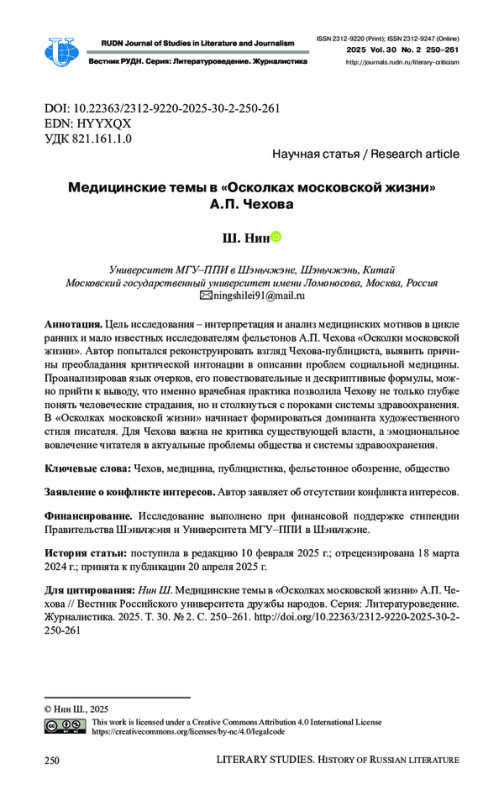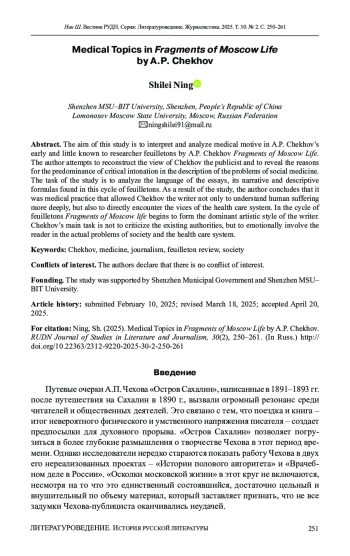 Цель исследования - интерпретация и анализ медицинских мотивов в цикле ранних и мало известных исследователям фельетонов А. П. Чехова «Осколки московской жизни». Автор попытался реконструировать взгляд Чехова-публициста, выявить причины преобладания критической интонации в описании проблем социальной медицины. Проанализировав язык очерков, его повествовательные и дескриптивные формулы, можно прийти к выводу, что именно врачебная практика позволила Чехову не только глубже понять человеческие страдания, но и столкнуться с пороками системы здравоохранения. В «Осколках московской жизни» начинает формироваться доминанта художественного стиля писателя. Для Чехова важна не критика существующей власти, а эмоциональное вовлечение читателя в актуальные проблемы общества и системы здравоохранения.