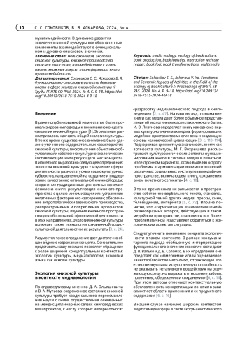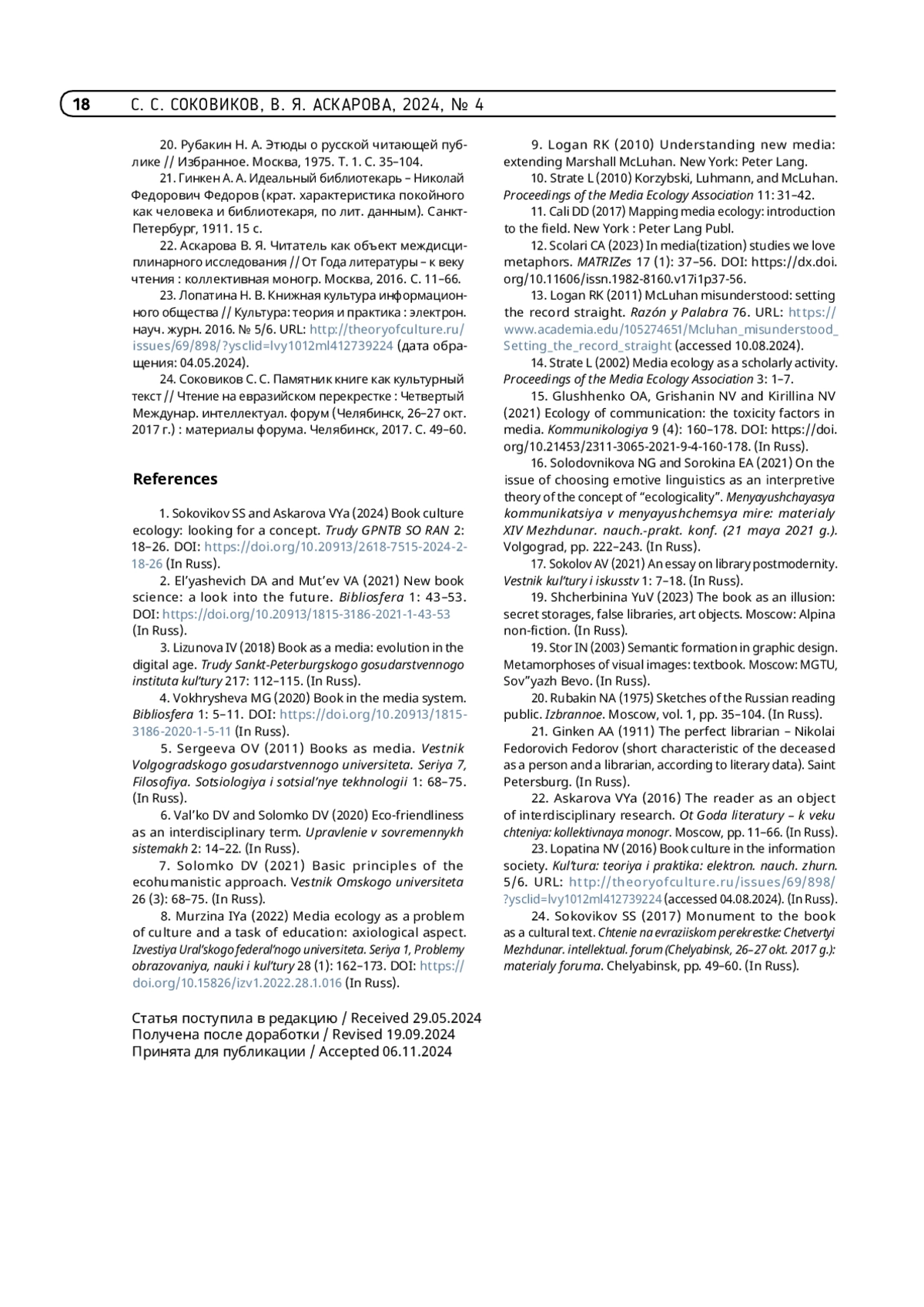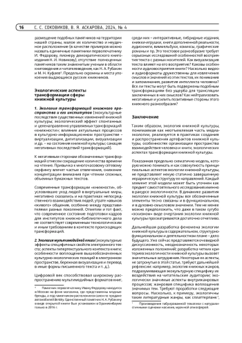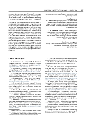 1. Соковиков С. С., Аскарова В. Я. Экология книжной культуры: к поискам концепта // Труды ГПНТБ СО РАН. 2024. № 2. С. 18-26. https://doi.org/10.20913/2618-7515-2024-2-18-26.