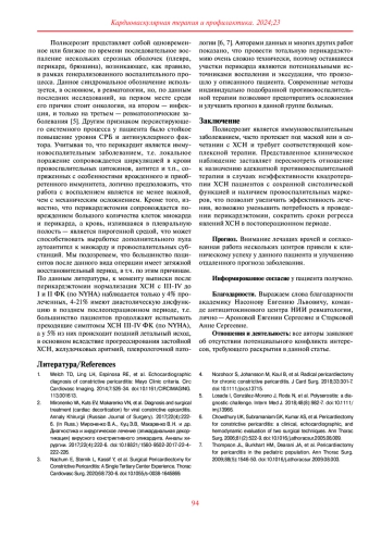 2. Мироненко В. А., Куц Э.В, Макаренко В. Н. и др. Диагностика и хирургическое лечение (эпикардиальная декортикация) вирусного констриктивного эпикардита. Анналы хирургии. 2017;22(4):222-6. DOI: 10.18821/1560-9502-2017-22-4-222-226