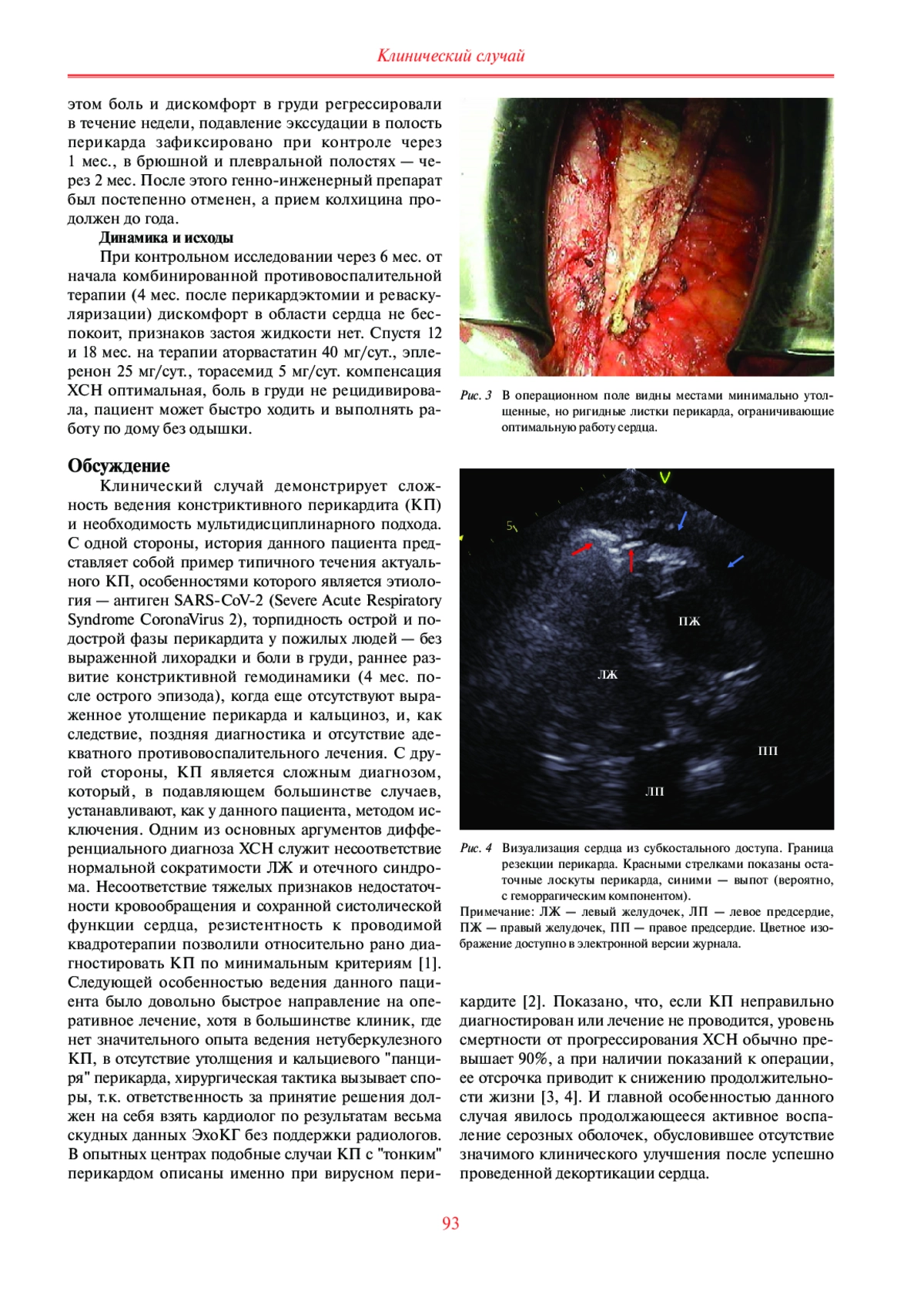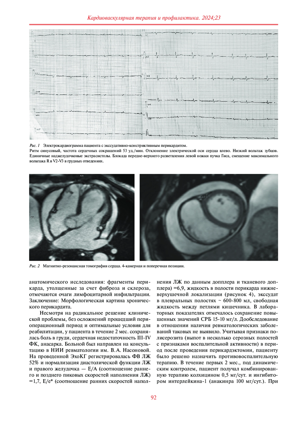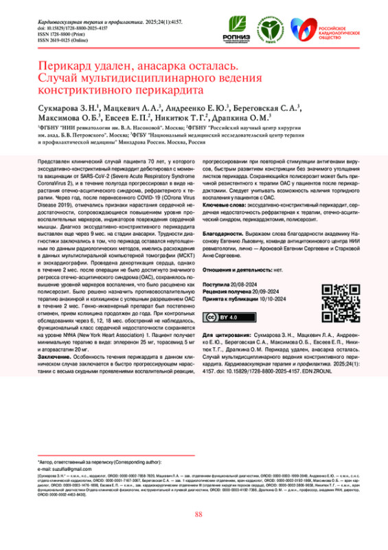 Представлен клинический случай пациента 70 лет, у которого экссудативно-констриктивный перикардит дебютировал с момента вакцинации от SARS-CoV-2 (Severe Acute Respiratory Syndrome CoronaVirus 2), и в течение полугода прогрессировал в виде нарастания отечно-асцитического синдрома, рефрактерного к терапии. Через год, после перенесенного COVID-19 (COrona VIrus Disease 2019), отмечались признаки нарастания сердечной недостаточности, сопровождающиеся повышением уровня провоспалительных маркеров, индикаторов повреждения сердечной мышцы. Диагноз экссудативно-констриктивного перикардита выставлен еще через 9 мес. на стадии анасарки. Трудности диагностики заключались в том, что перикард оставался неутолщенным по данным радиологических методов, имелись расхождения в данных мультиспиральной компьютерной томографии (МСКТ) и эхокардиографии. Проведена декортикация сердца, однако в течение 2 мес. после операции не было достигнуто значимого регресса отечно-асцитического синдрома (ОАС), сохранялось повышение уровней маркеров воспаления, что было расценено как полисерозит. Было решено назначить противовоспалительную терапию анакинрой и колхицином с успешным разрешением ОАС в течение 2 мес. Генно-инженерный препарат был постепенно отменен, прием колхицина продолжен до года. При контрольных обследованиях через 6, 12, 18 мес. обострений не наблюдалось, функциональный класс сердечной недостаточности сохраняется на уровне NYHA (New York Heart Association) 1. Пациент получает минимальную терапию в виде: эплеренон 25 мг, торасемид 5 мг и аторвастатин 20 мг.