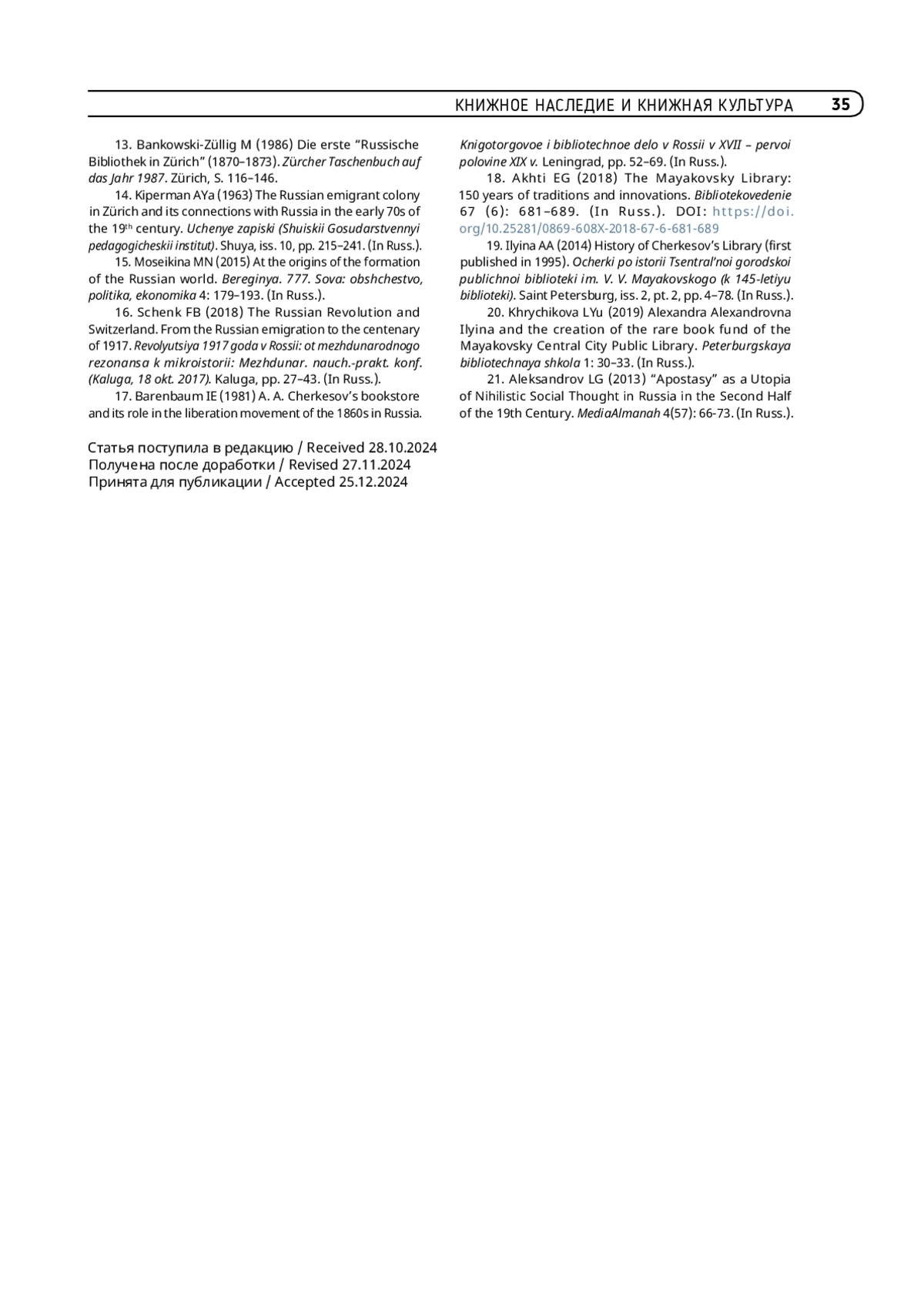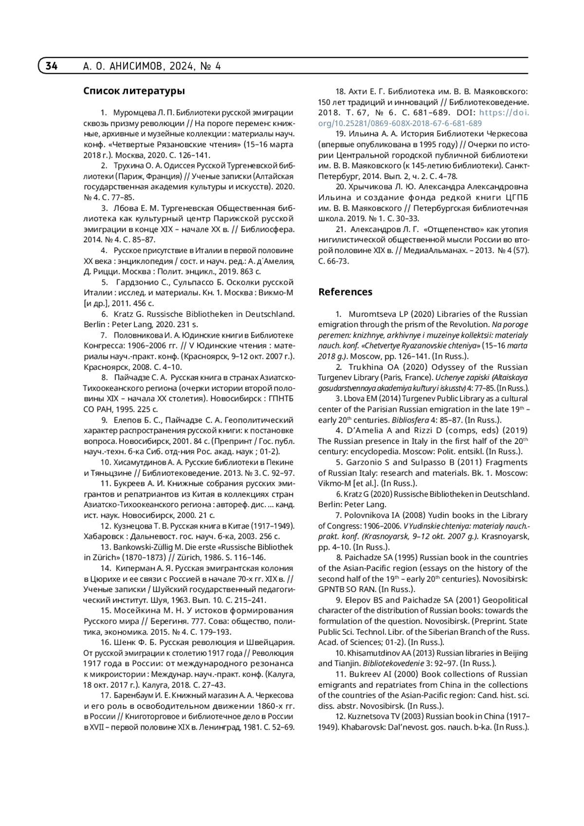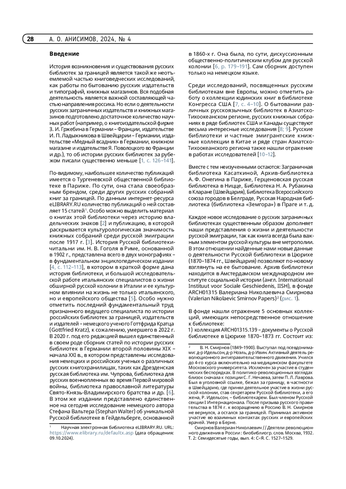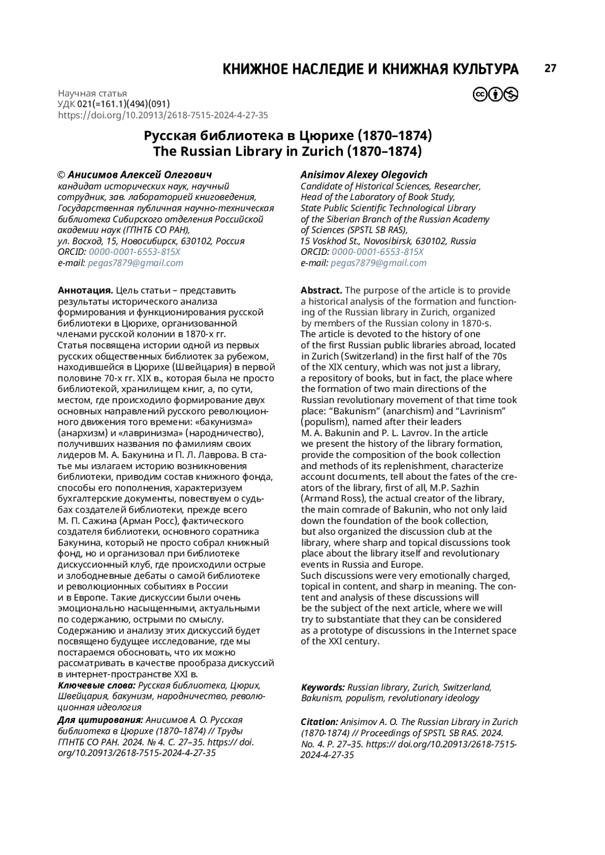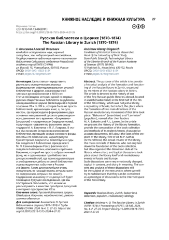 АНИСИМОВ А. О. РУССКАЯ БИБЛИОТЕКА В ЦЮРИХЕ (1870–1874) // ТРУДЫ ГПНТБ СО РАН. 2024. № 4