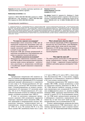 Гипертрофия левого желудочка (ГЛЖ), являющаяся основным проявлением гипертензивной болезни сердца, регистрируется у 15- 45% пациентов с артериальной гипертензией (АГ), достигая 77% у больных с резистентной АГ, сопутствующим сахарным диабетом 2 типа и перенесенным сердечно-сосудистым событием. В представленном обзоре изложены основные вопросы определения, патофизиологии, эпидемиологии, диагностики и регрессии ГЛЖ на фоне антигипертензивной терапии. Приводятся рекомендации, критерии выявления, преимущества и недостатки электрокардиографии и эхокардиографии в ведении больных с АГ и ГЛЖ. Особое внимание в обзоре уделено обсуждению влияния ГЛЖ на сердечно-сосудистый прогноз и обоснованности регрессии гипертрофии. ГЛЖ нередко протекает с отсутствием или со стертыми клиническими проявлениями, однако со временем увеличивает риск развития сердечной недостаточности, фибрилляции предсердий, ишемической болезни сердца, внезапной сердечной смерти, инсульта и смерти от всех причин. Отмечается, что благодаря своевременному и адекватному применению антигипертензивной терапии удается не только снизить артериальное давление, но и добиться регрессии ГЛЖ, что благоприятно влияет на исход заболевания. Представлены основные группы лекарственной терапии, вызывающей регрессию ГЛЖ, среди которых подробно обсуждаются блокаторы ренин-ангиотензинальдостероновой системы (ингибиторы ангиотензинпревращающего фермента, блокаторы рецепторов ангиотензина II, включая в комбинации с ингибитором неприлизина), β-адреноблокаторы, блокаторы кальциевых каналов, ингибиторы натрий-глюкозного котранспортера 2 типа и диуретики.